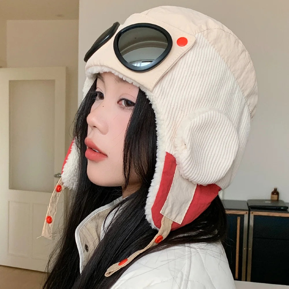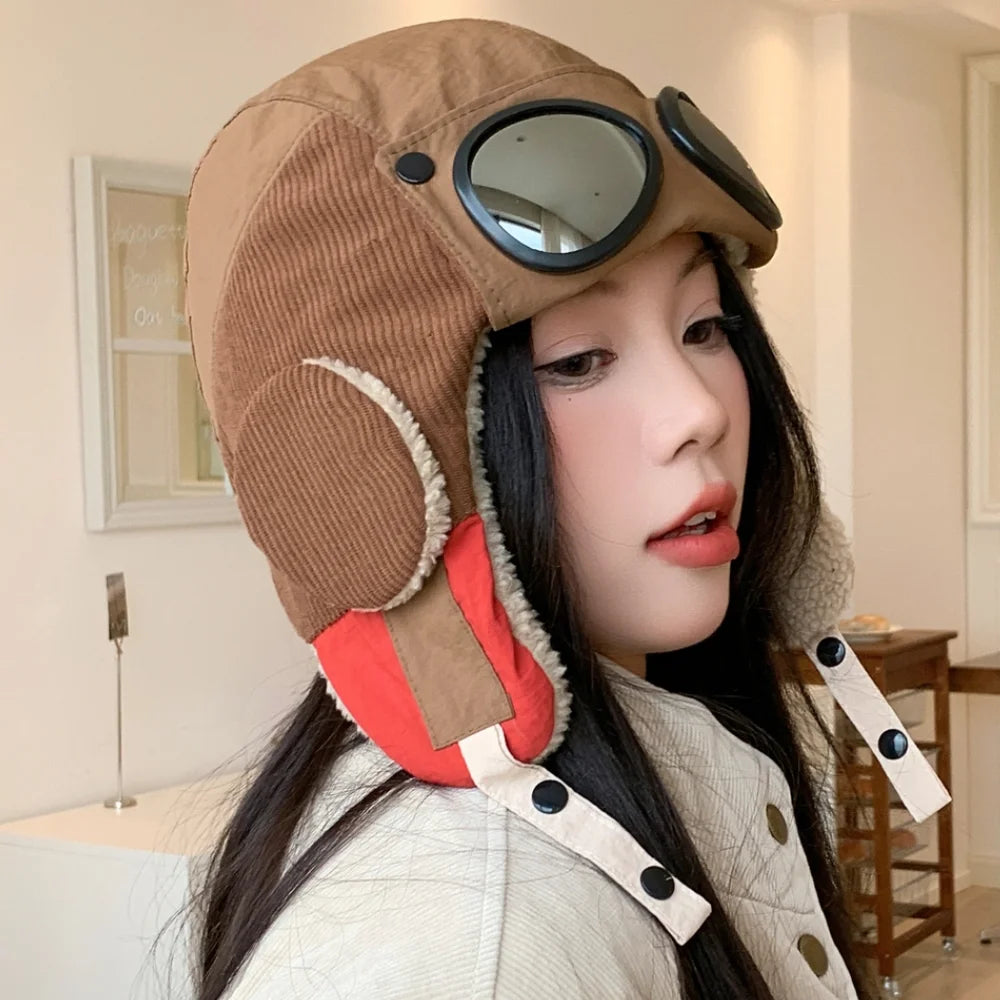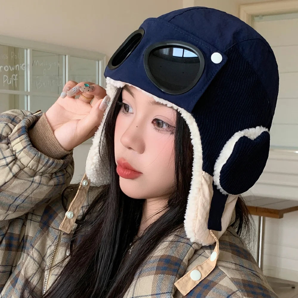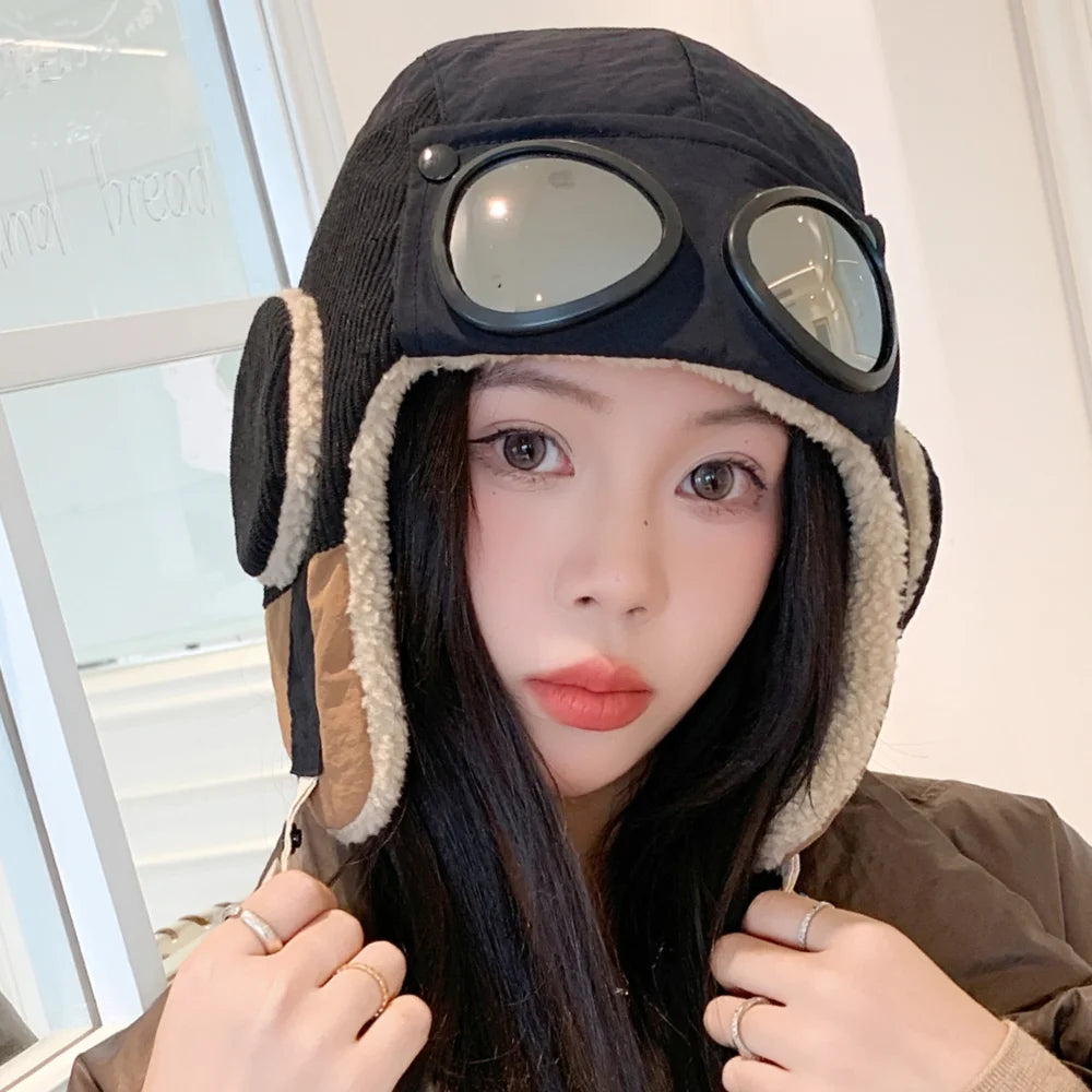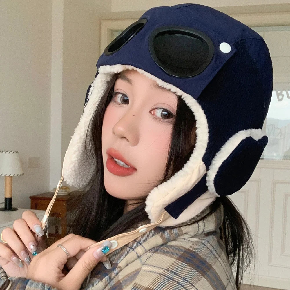 Women Warm Bomber Hats With Goggles Plush Fur Winter Hat With Earflap Winter ...