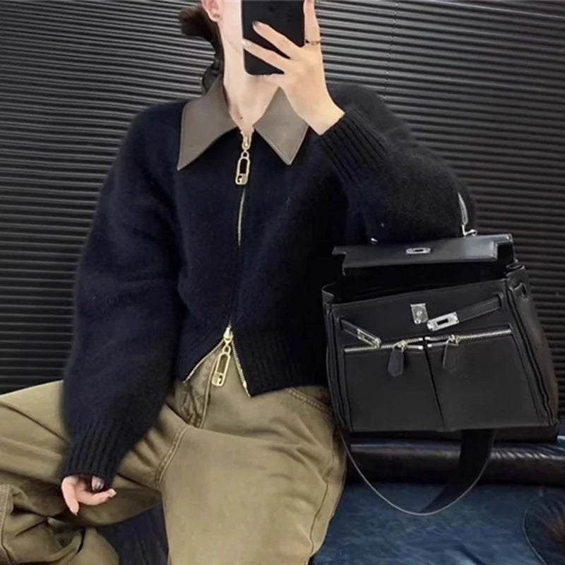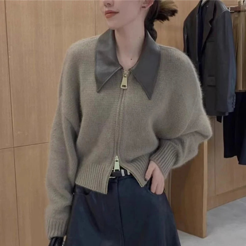 Double Zippers Knitted Cardigan Women Chic Patchwork Short Sweater Tops Woman Spring Autumn Pu Leather Po...