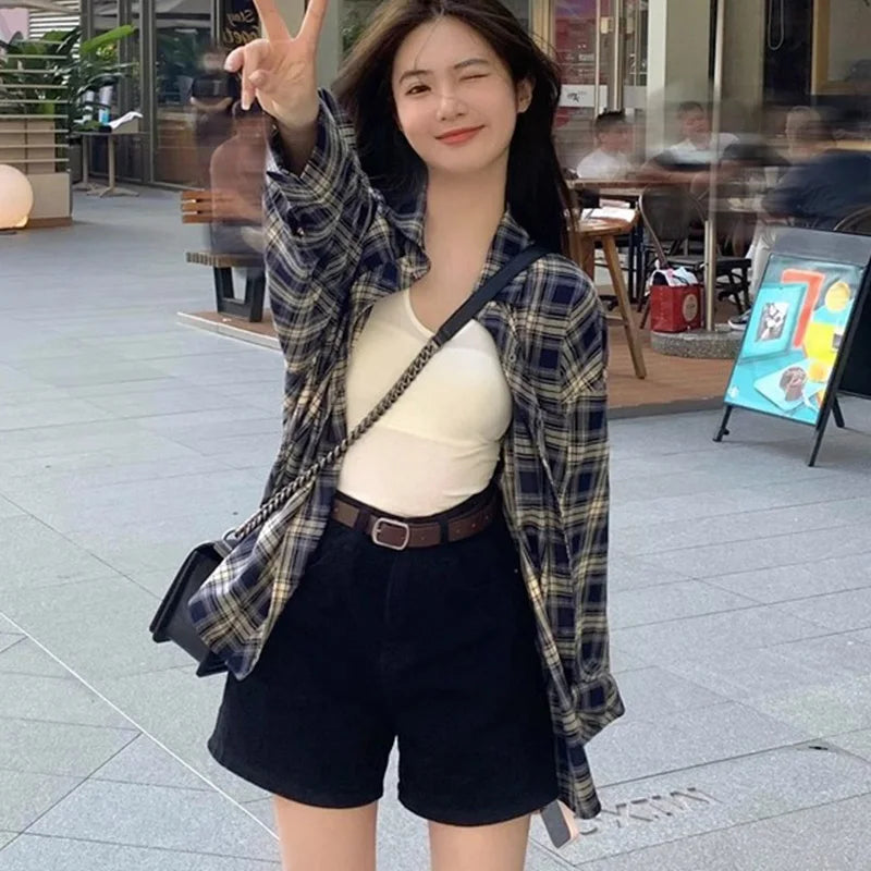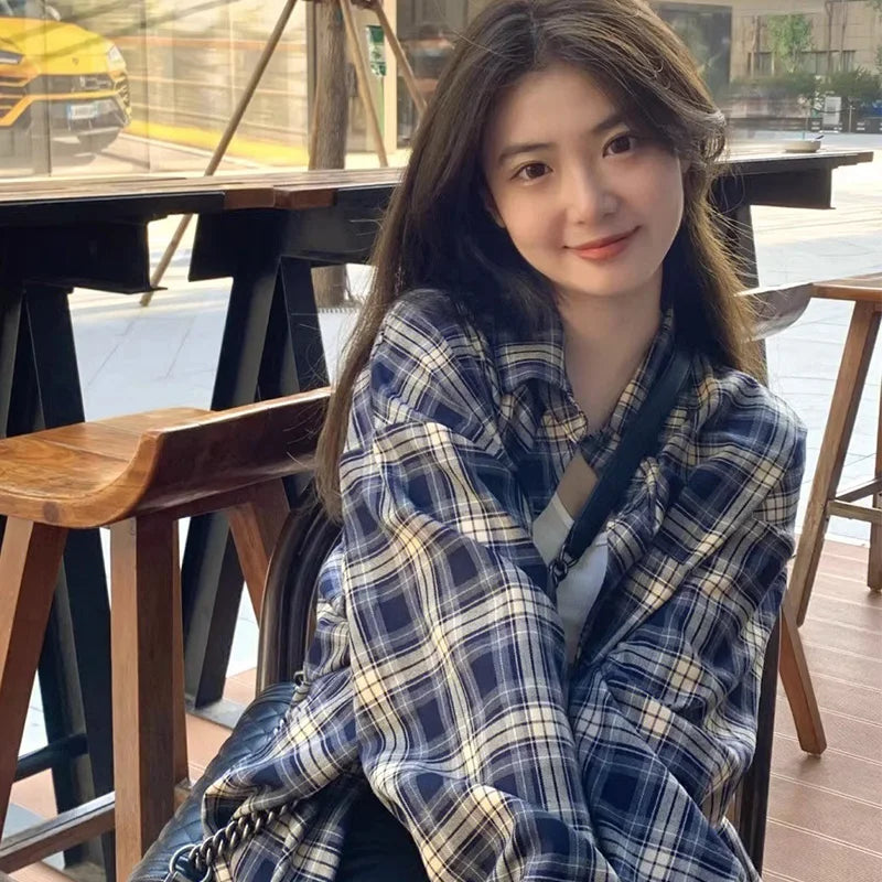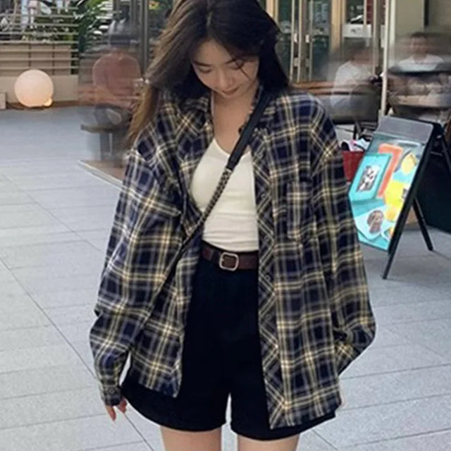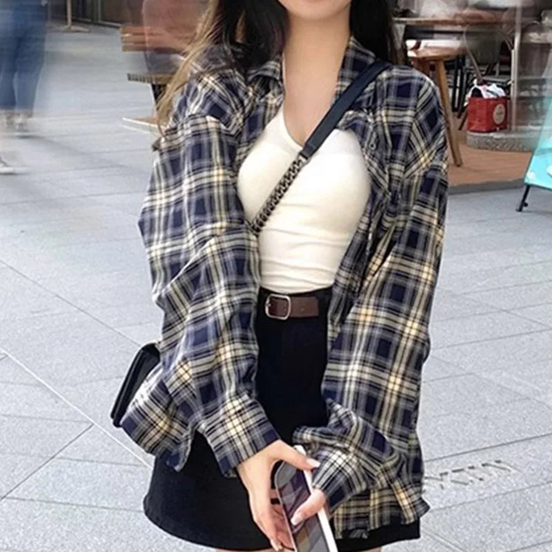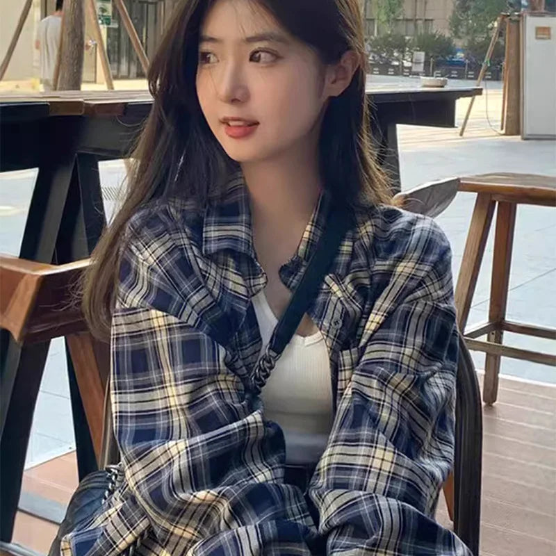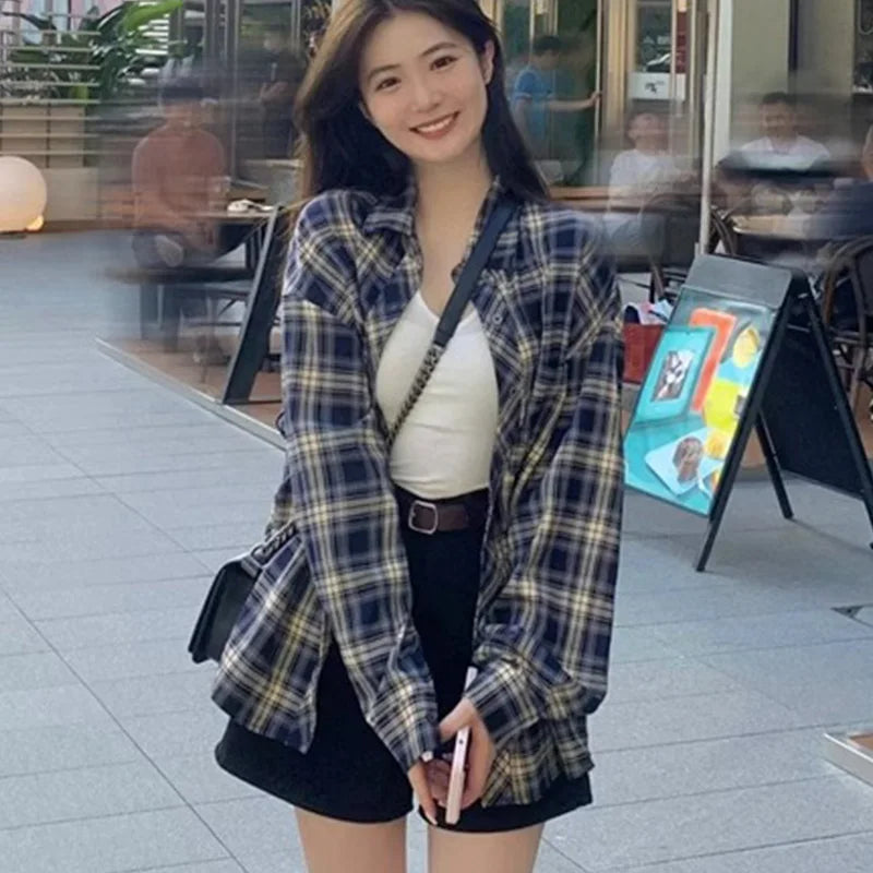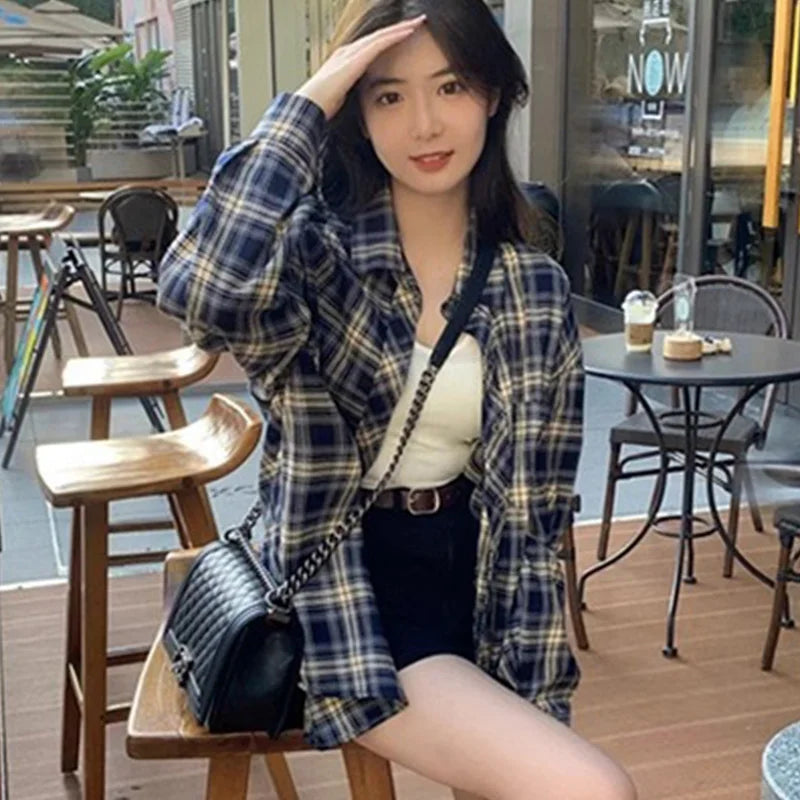 Retro Button Up Plaid Shirts for Women Spring Autumn Korean Long Sleeve Mid-Length Skirt Woman Turn Down ...