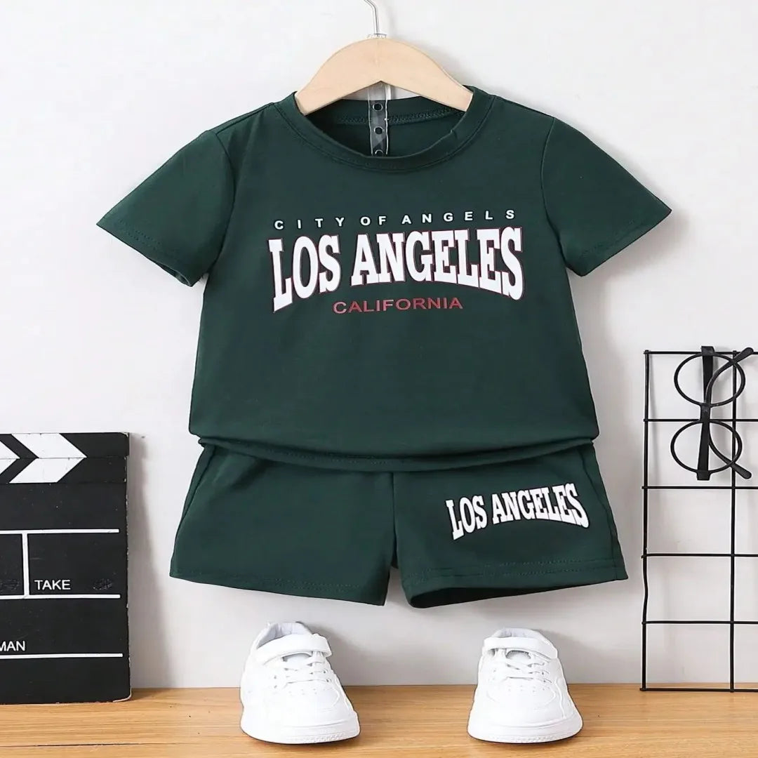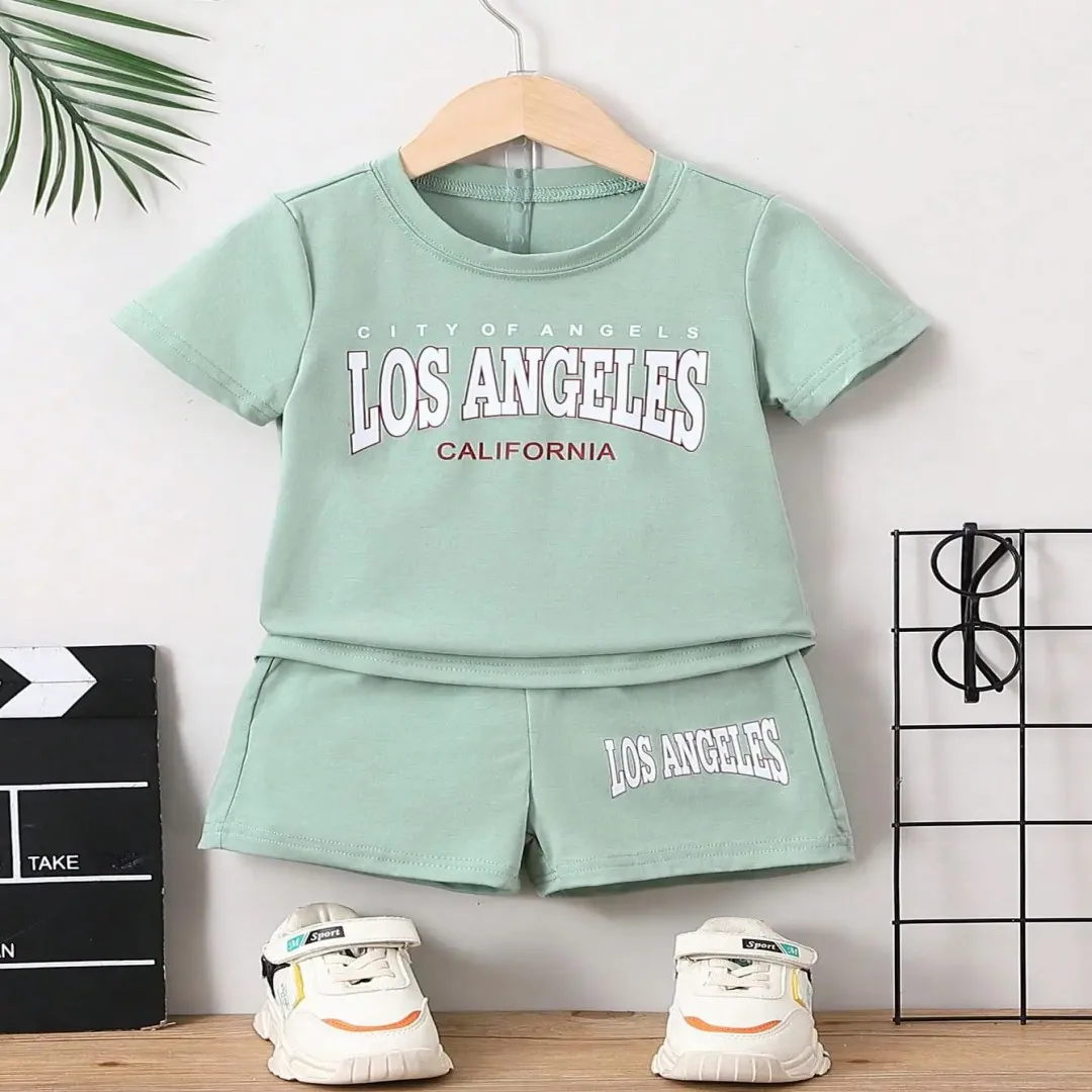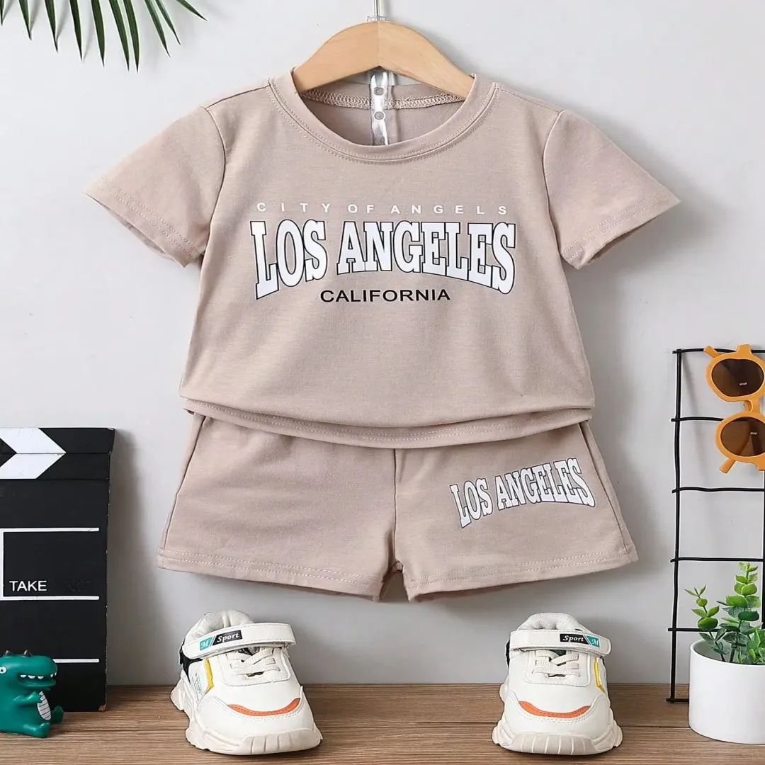 boys retro Los Angeles letter printed short sleeved shorts, summer casual and