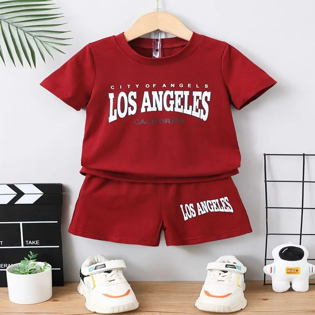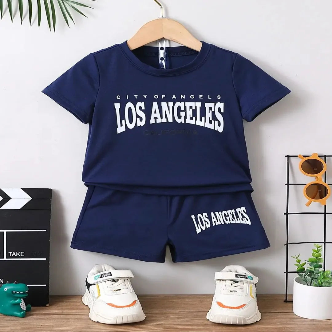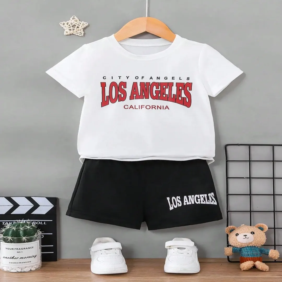 boys retro Los Angeles letter printed short sleeved shorts, summer casual and