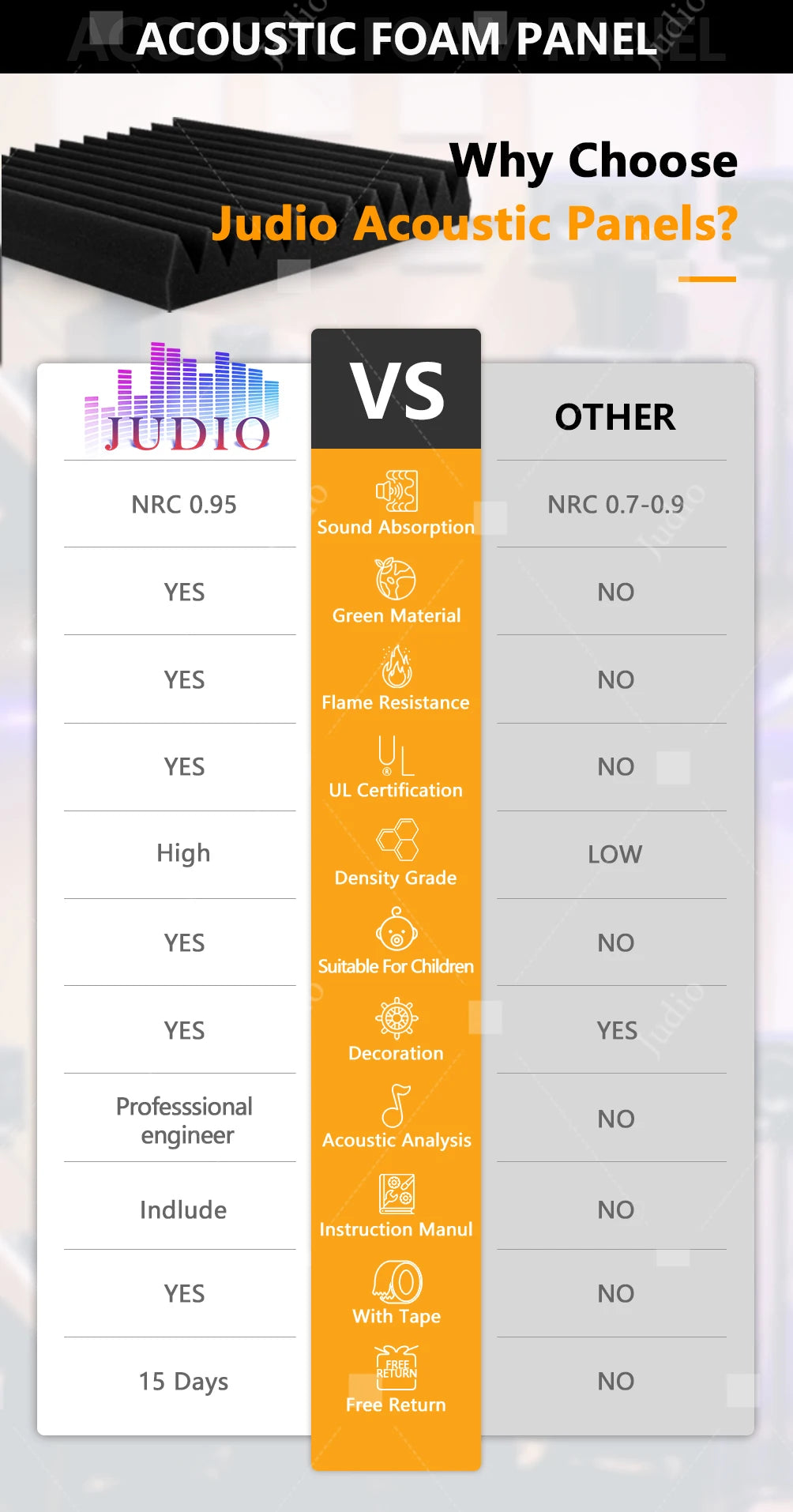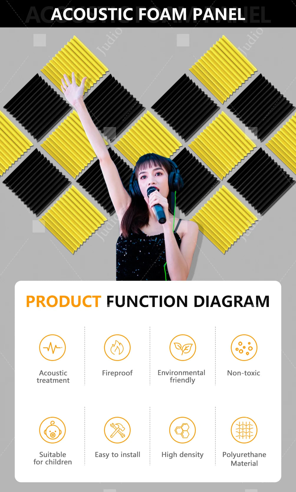 Judio is a sound absorbing material manufacturer with ten years of experience, we are committed to providing affordable and healthy sound absorbing panels for acoustic treatment.