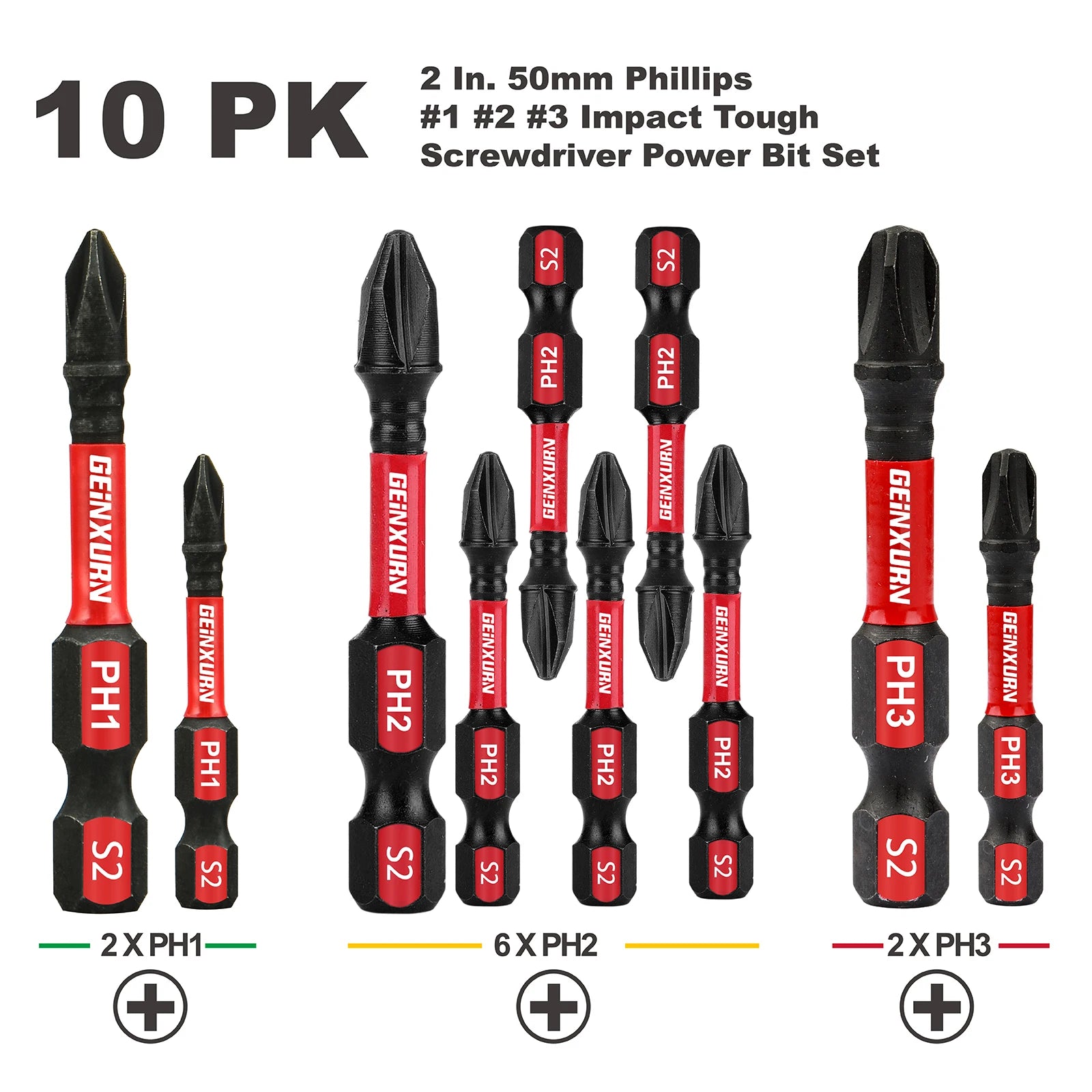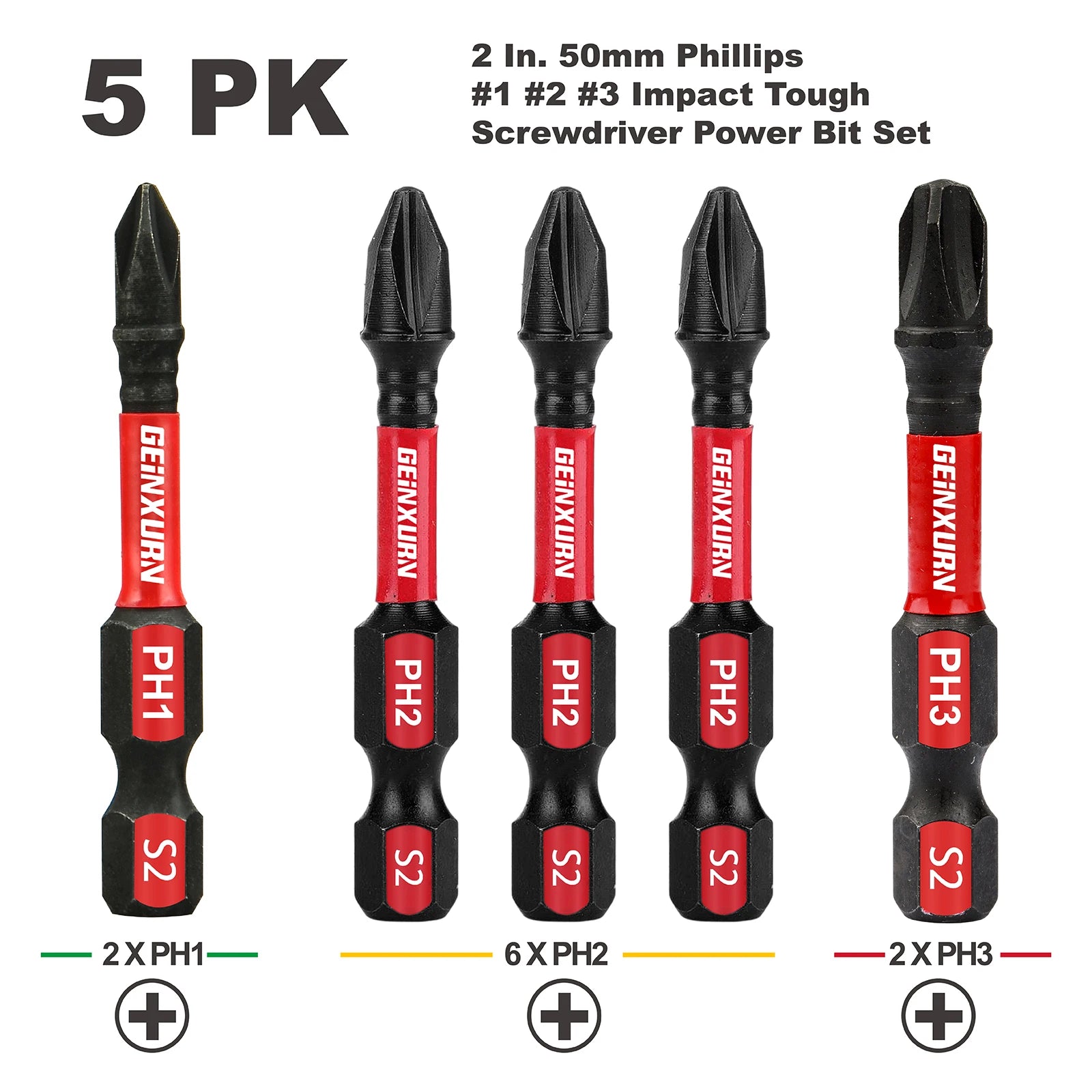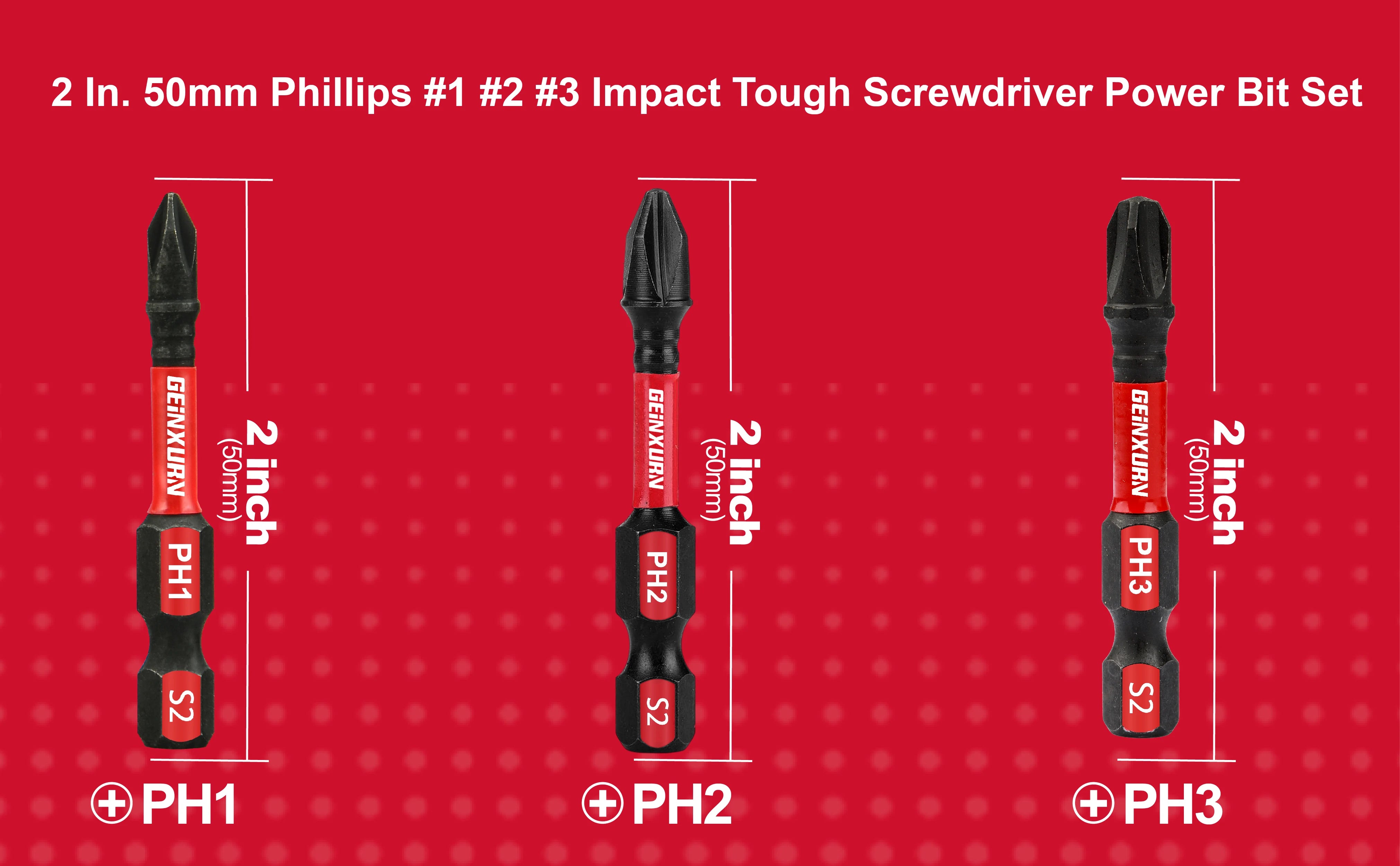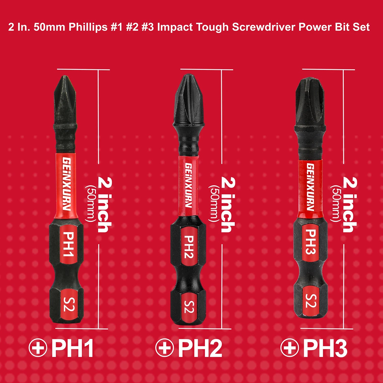 Geinxurn 2 in. Impact Tough #1#2 #3 Phillips Screwdriver Bits Set, S2 Alloy