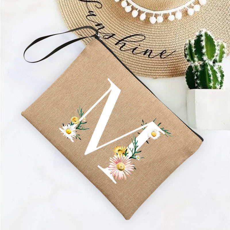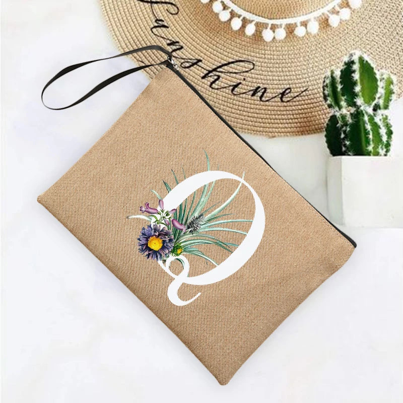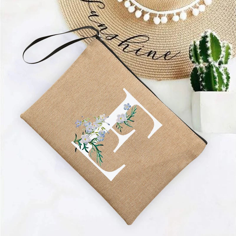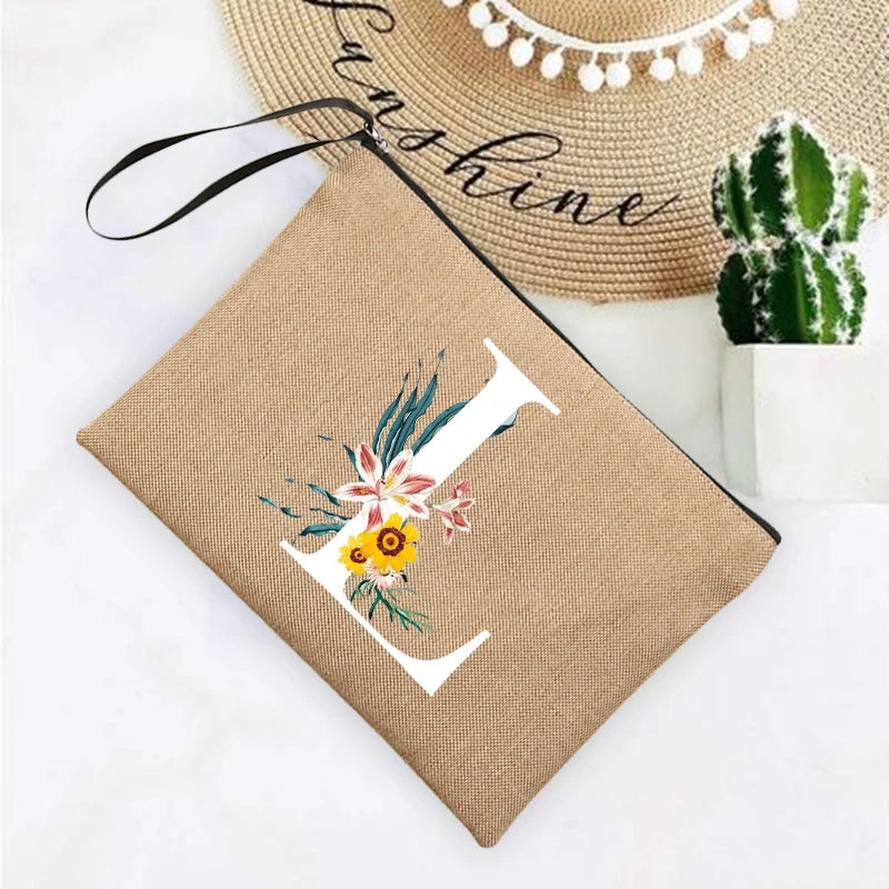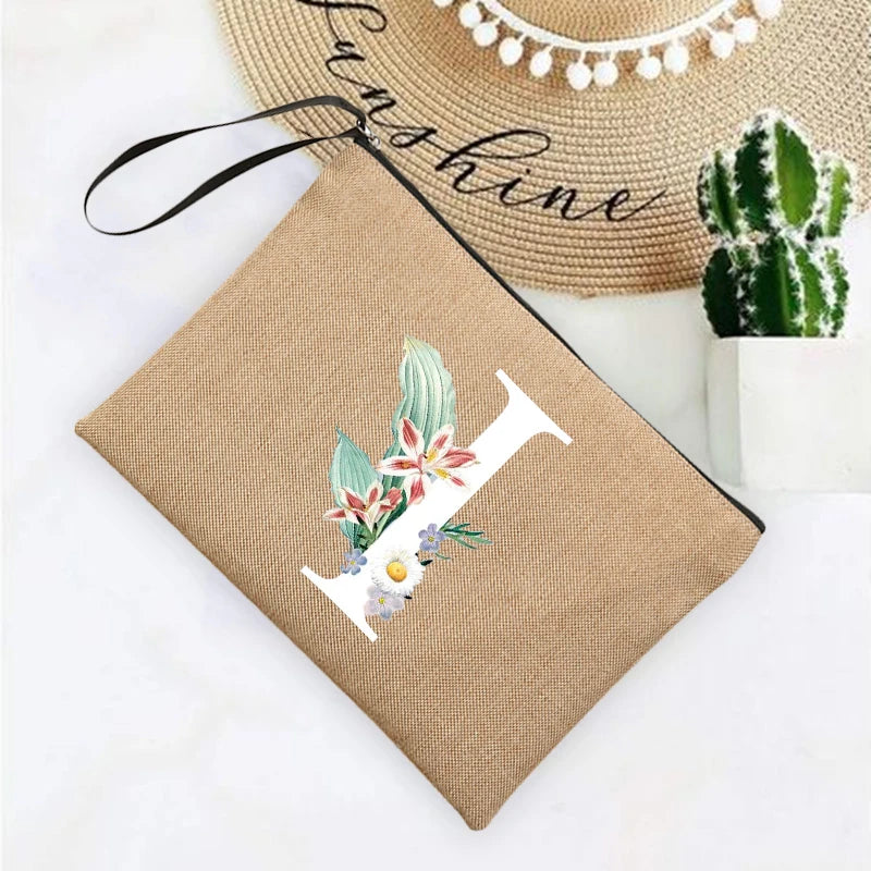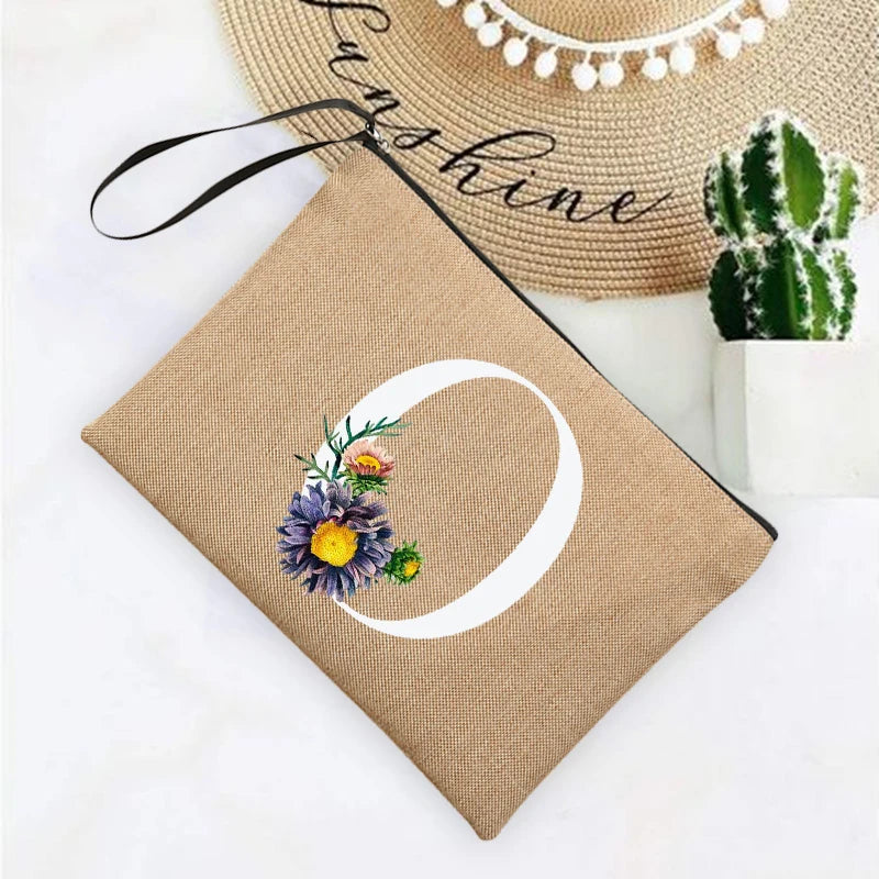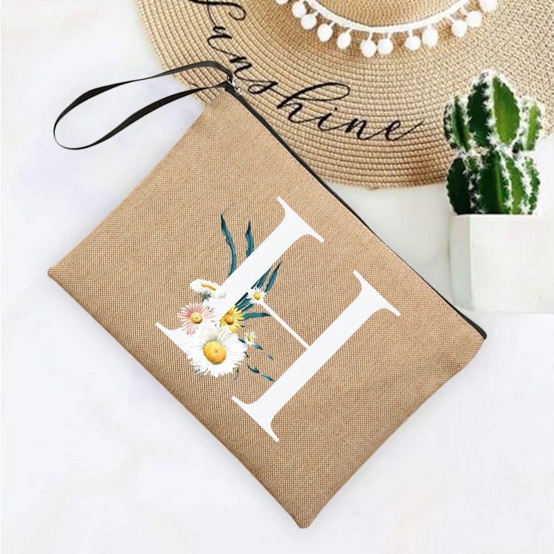 Initial Letter Flower Linen Zipper Pouch Women Cosmetic Bags Mujer Bolsa