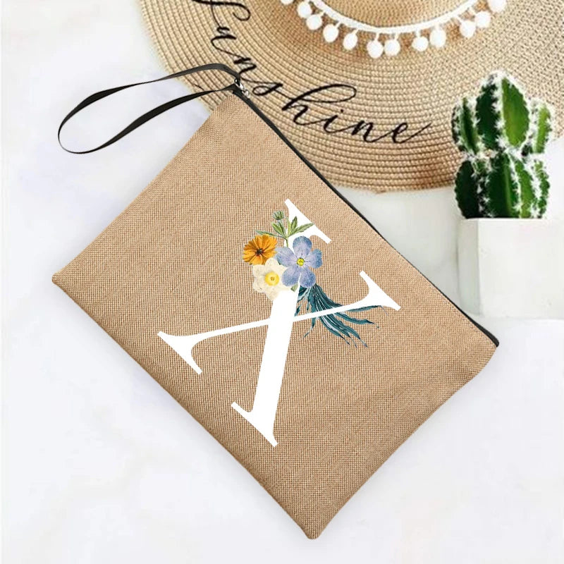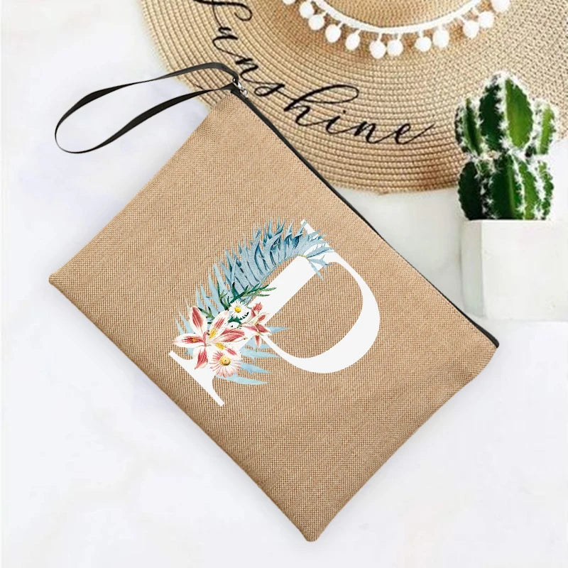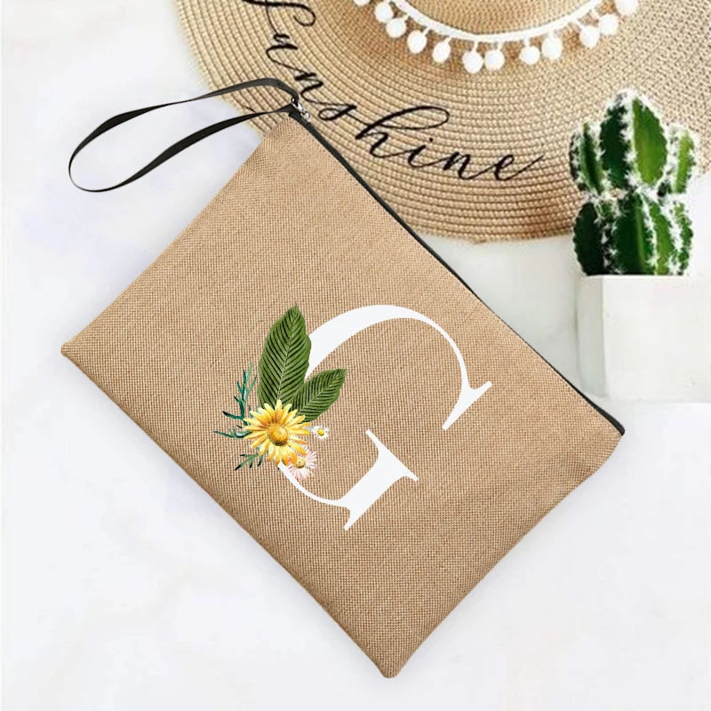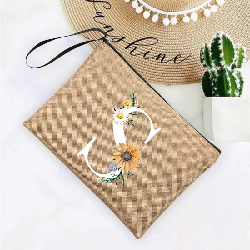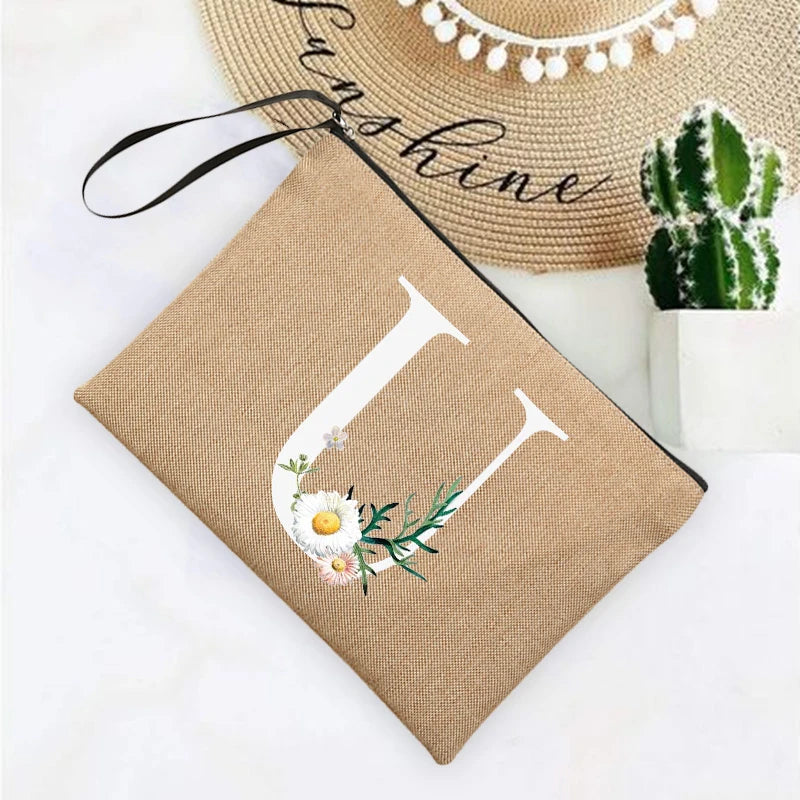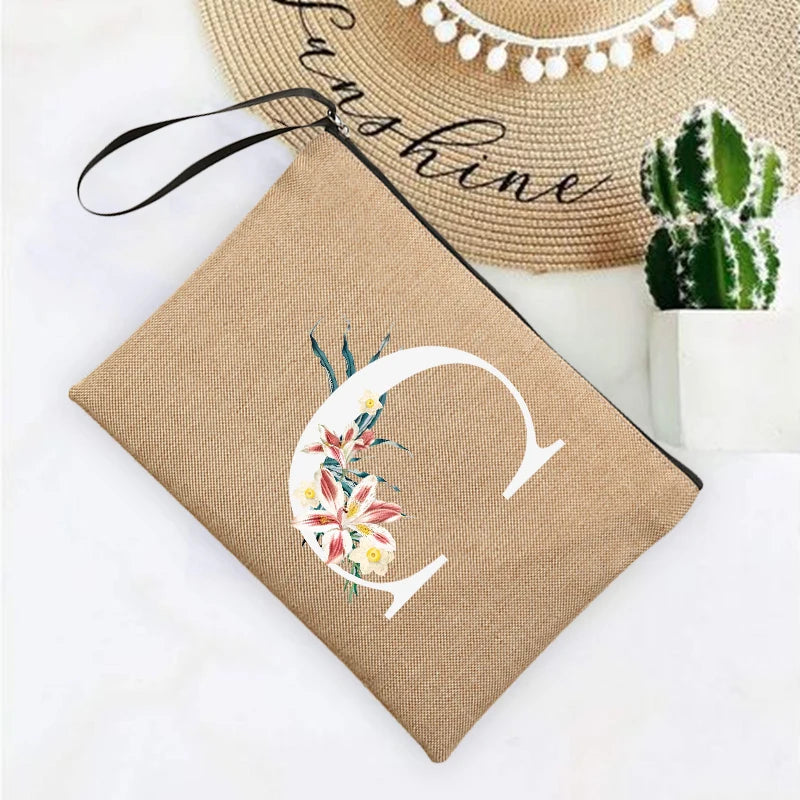 Initial Letter Flower Linen Zipper Pouch Women Cosmetic Bags Mujer Bolsa