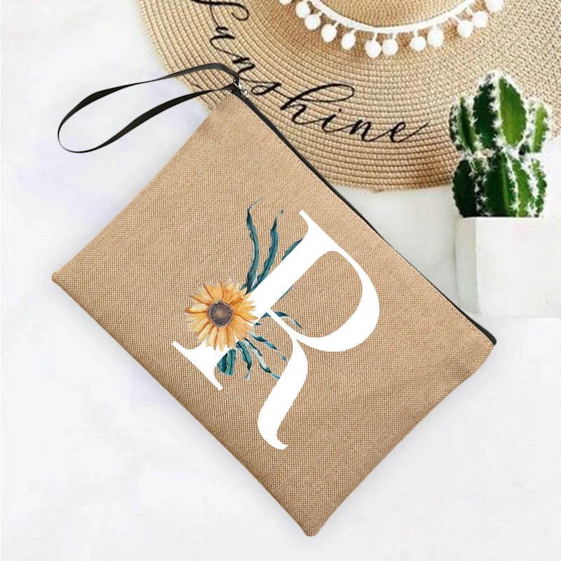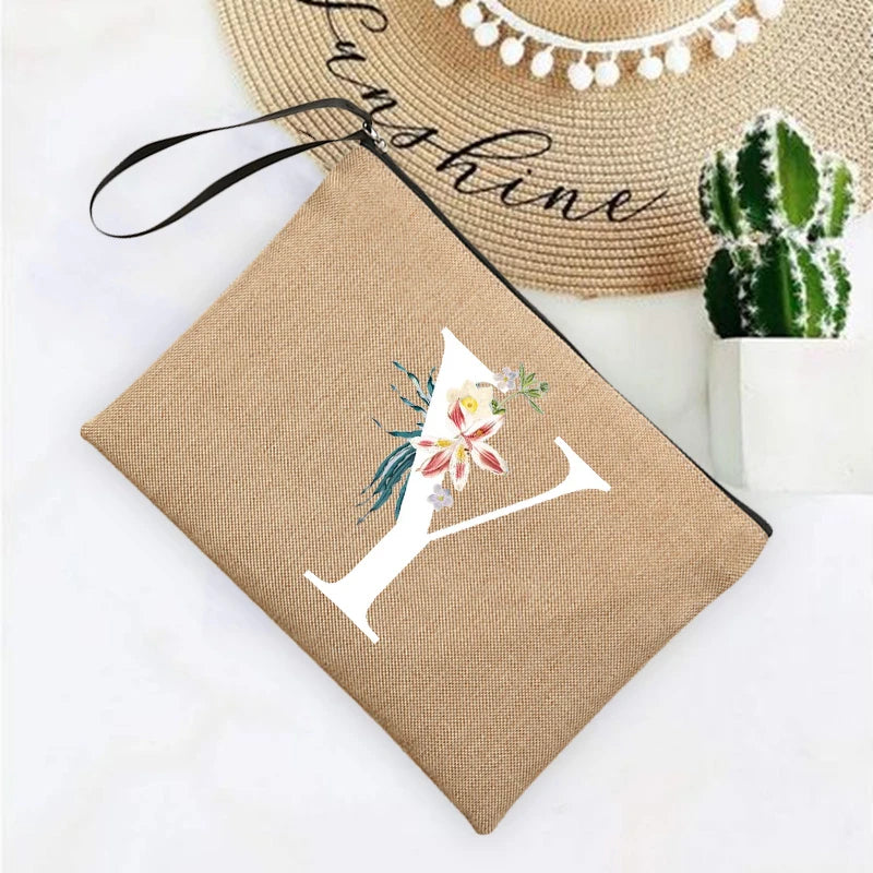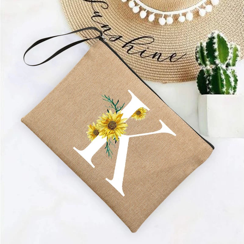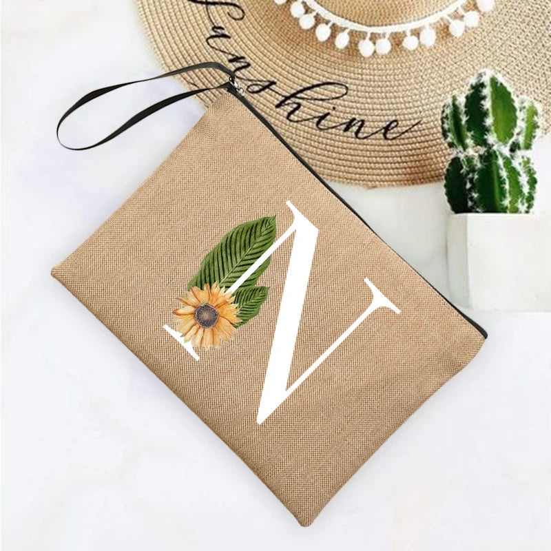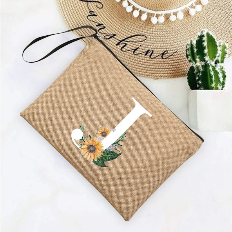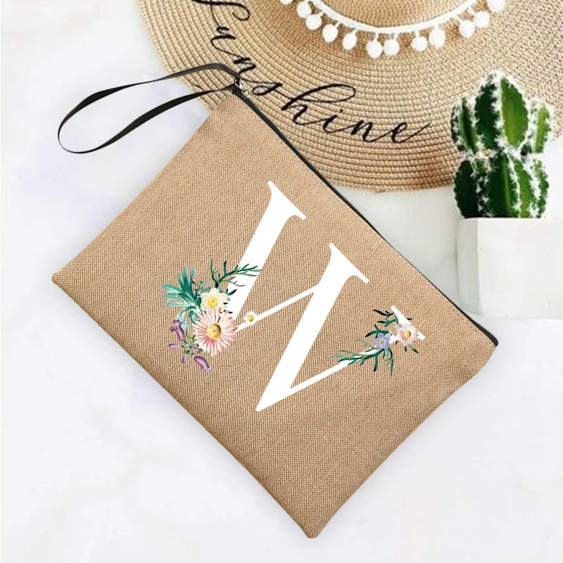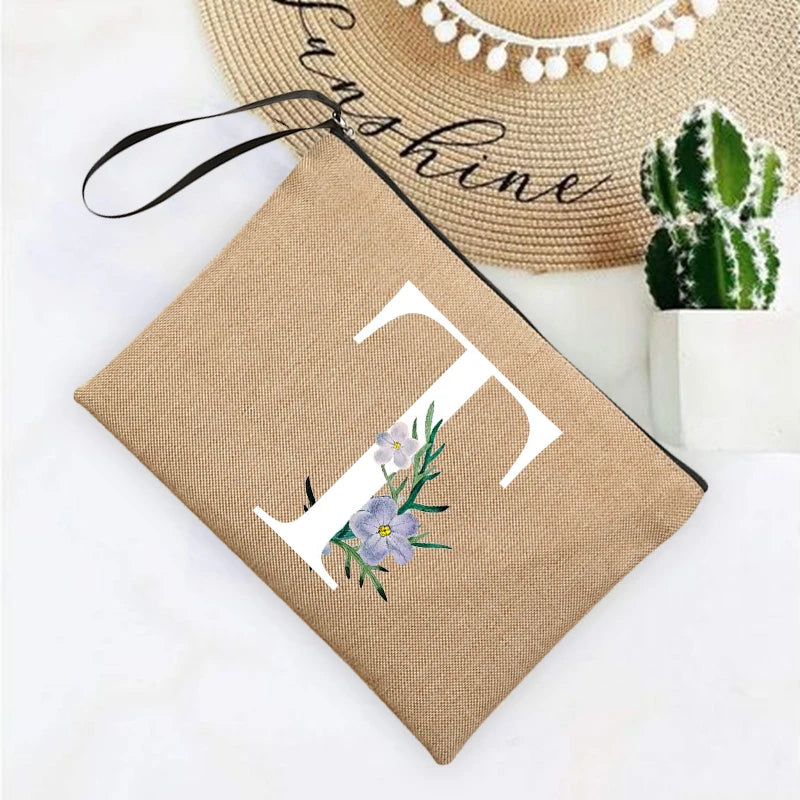 Initial Letter Flower Linen Zipper Pouch Women Cosmetic Bags Mujer Bolsa