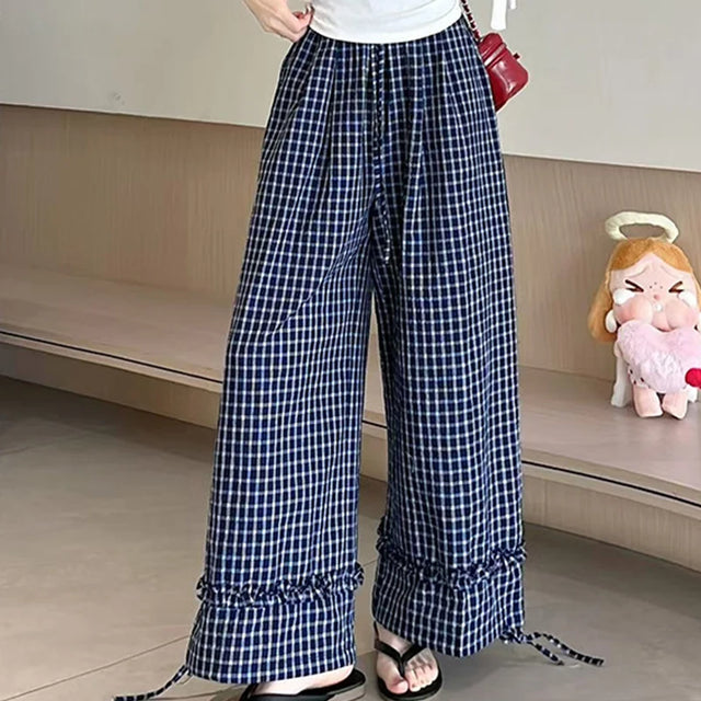 Summer Casual Plaid Long Pants for Women 2025 Drawstring Wide-Leg Pants Woman Loose Cotton Sports Pants f...