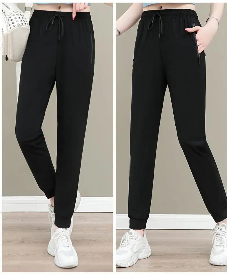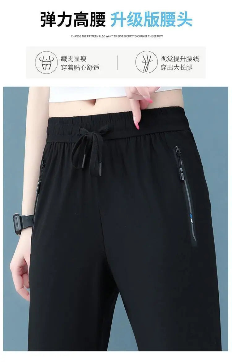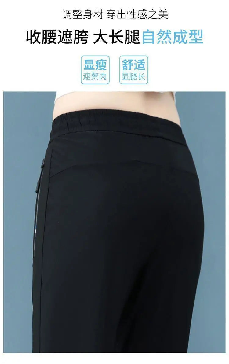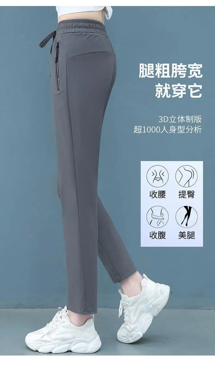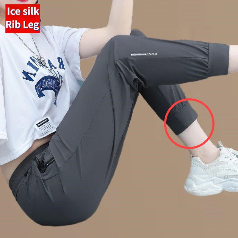 Women's Spring Summer Thin Ice Silk Pants Comfortable Breathable Casual Elastic Beam Feet Pants Slim Spor...