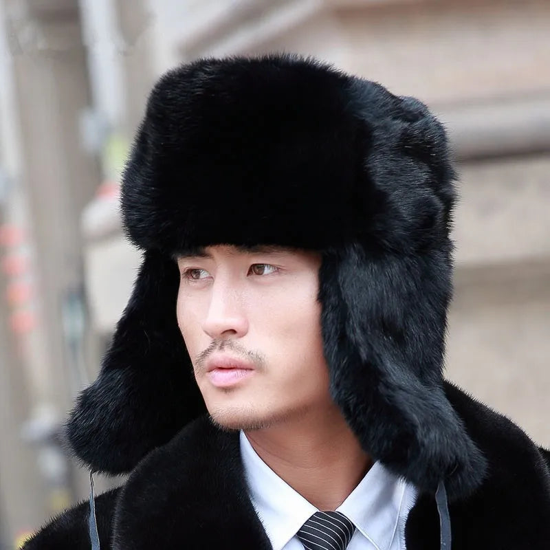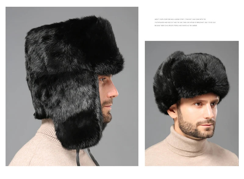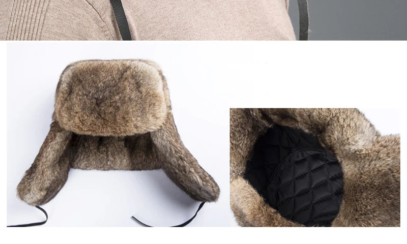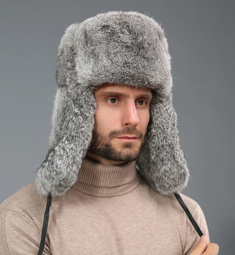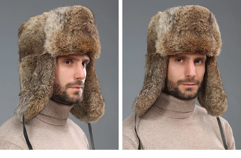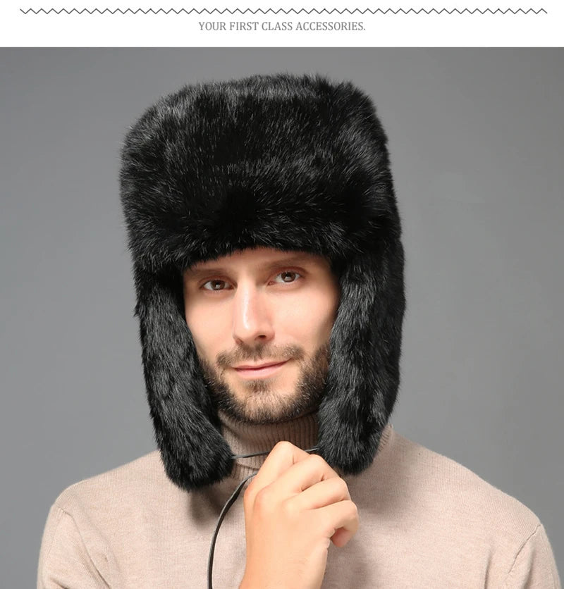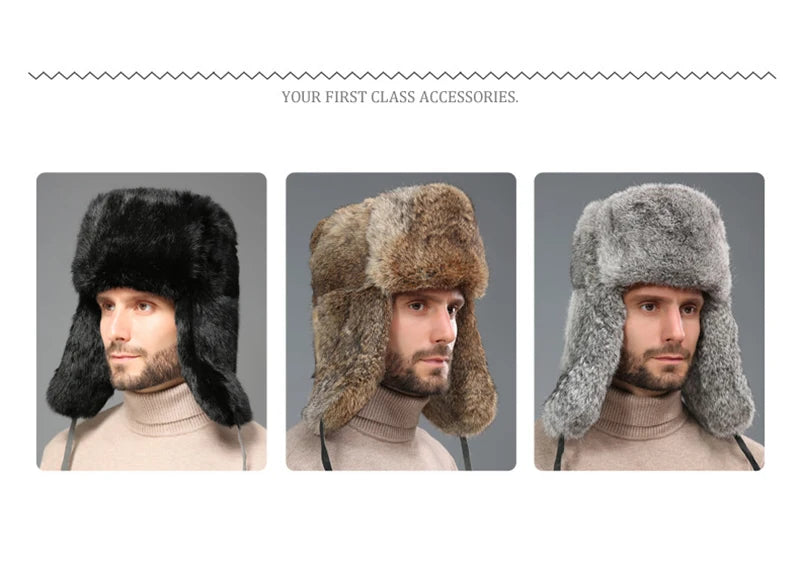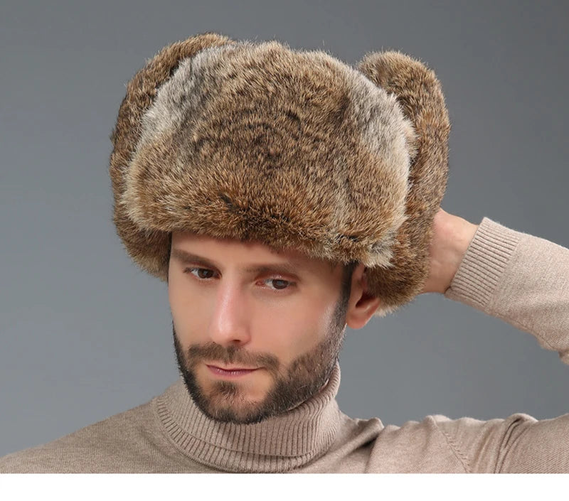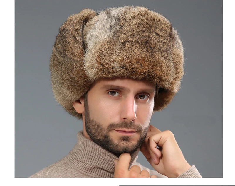 Fashion Thick Warm Bomber Hat Men Real Rabbit Fur Earflap Trapper Russian Cap...