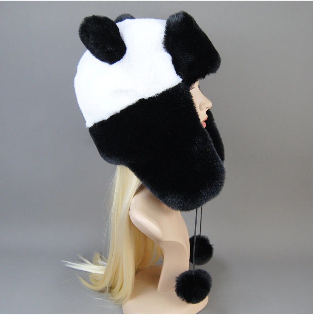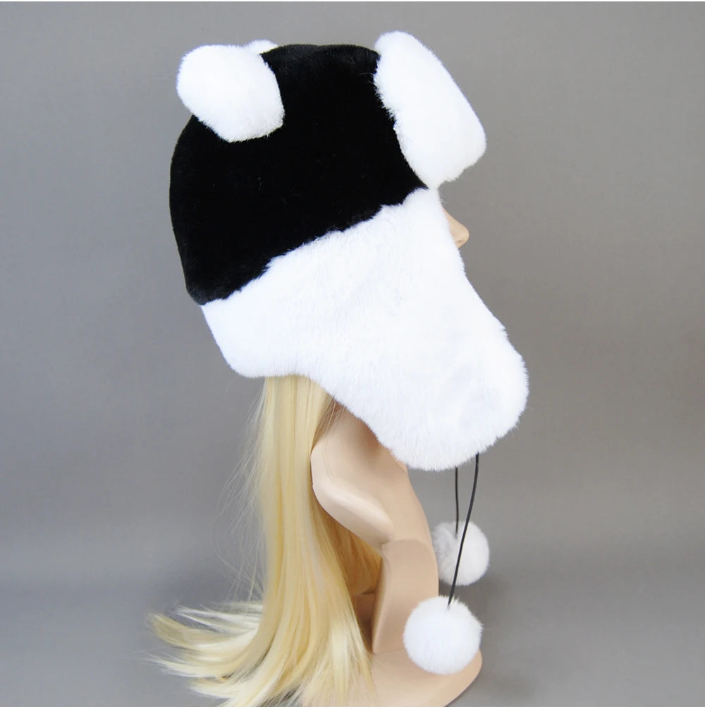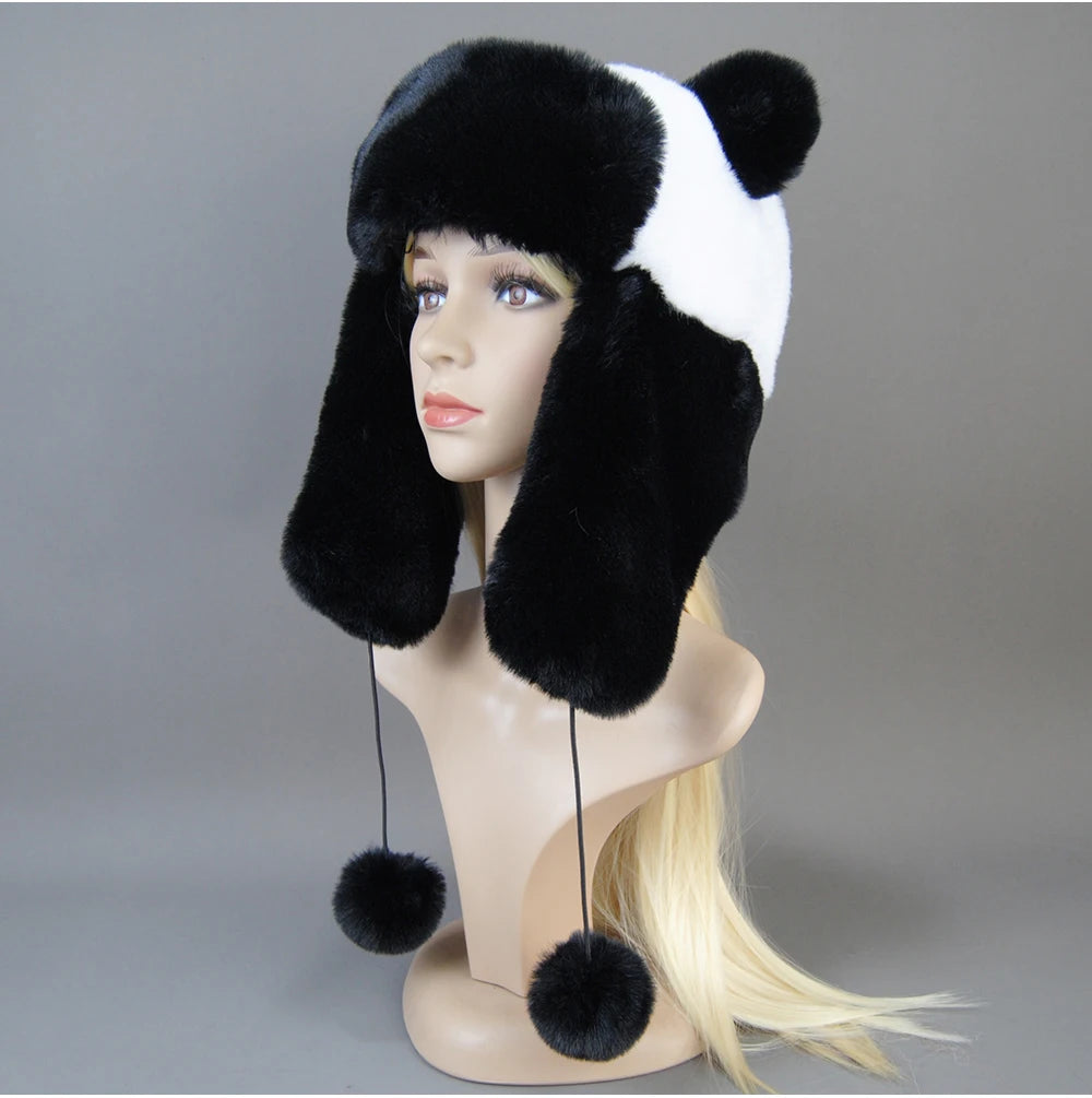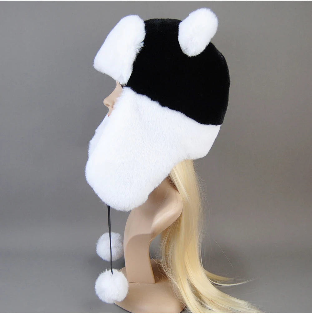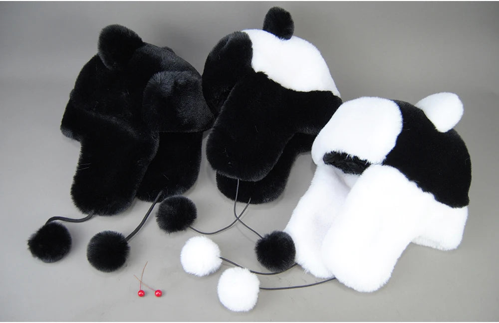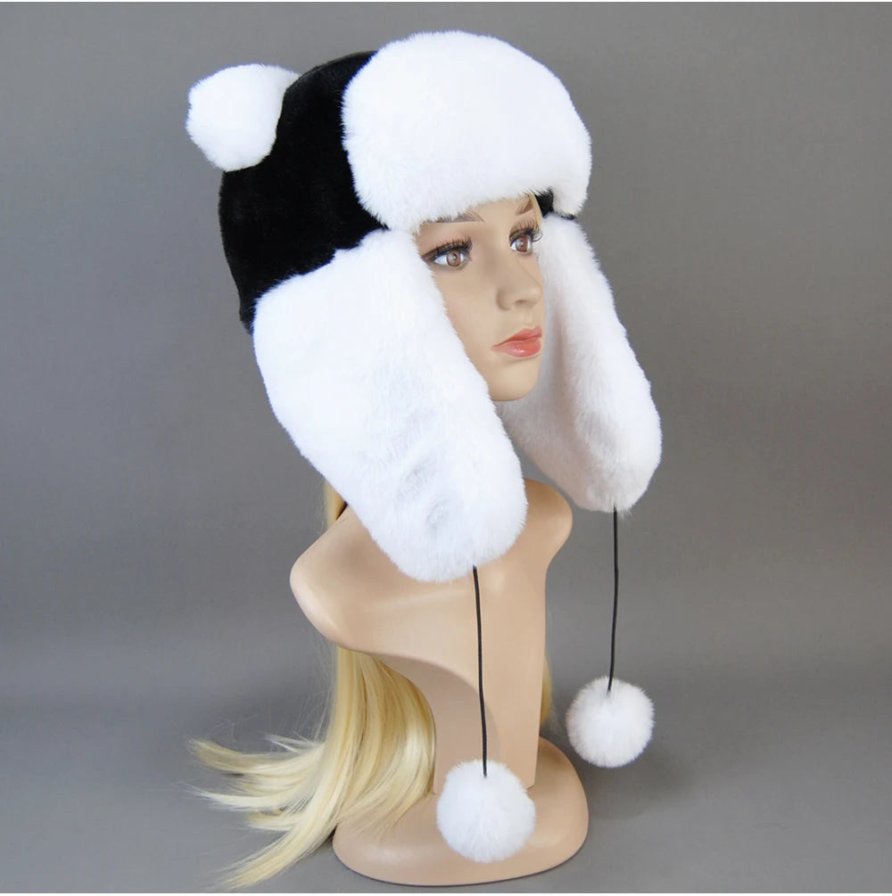 Women False Rex Rabbit False Fur Hat Winter Warm Fur Hat Black and White Pand...