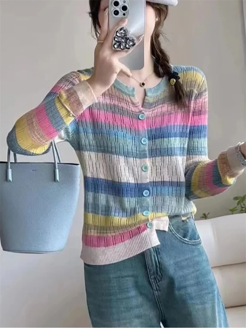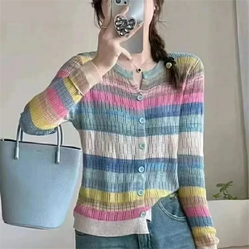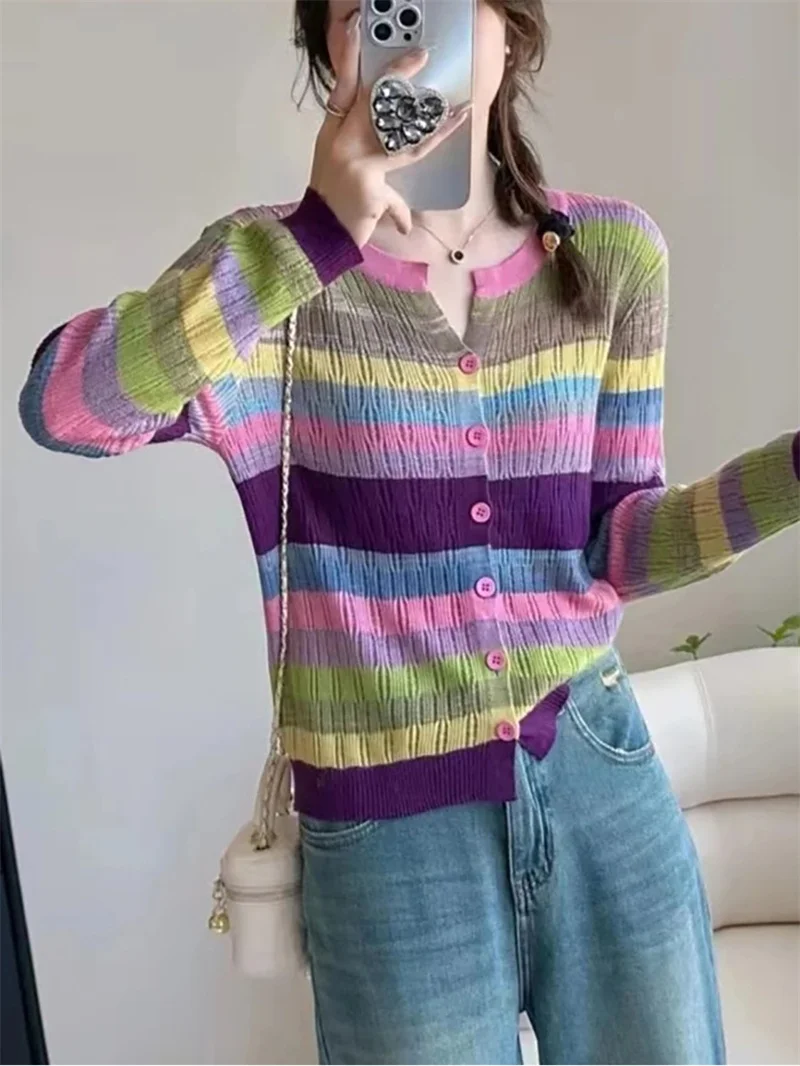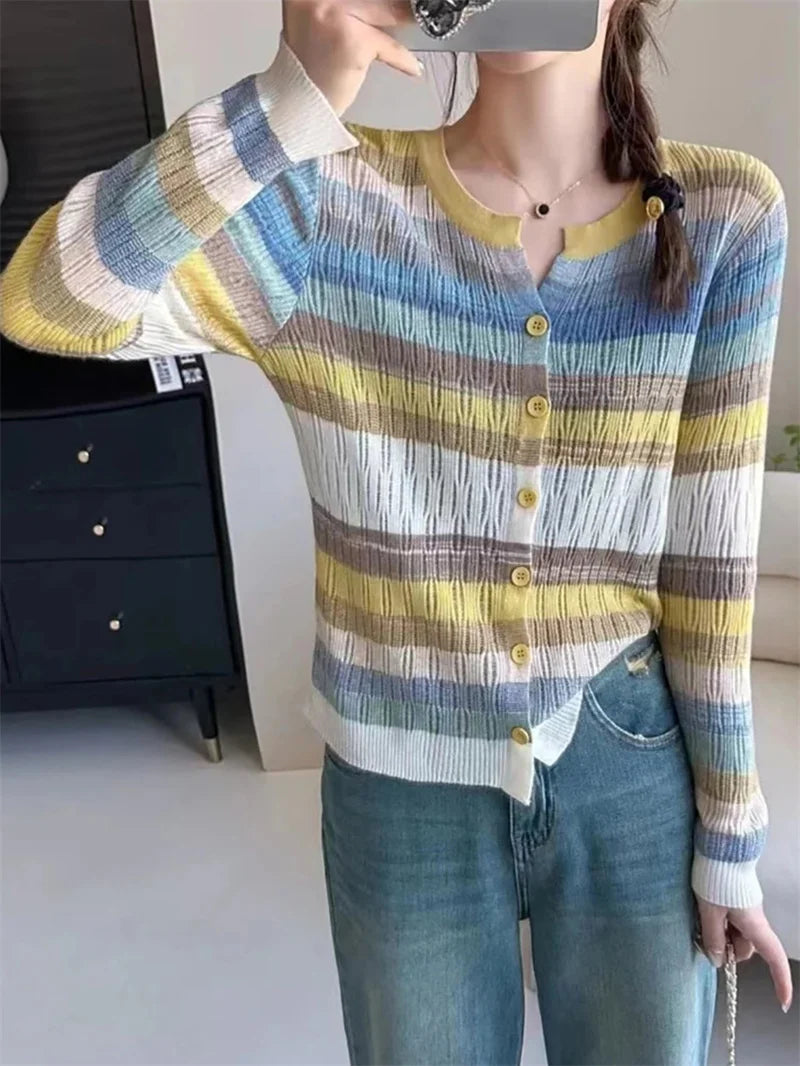 2025 Nieuwe herfst damestrui Koreaanse korte mode stiksels gestreepte breisels vest dames lange mouw trui...