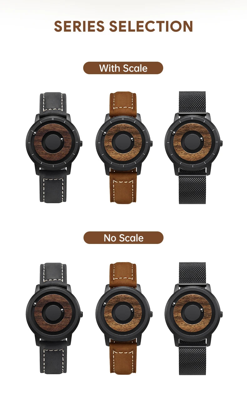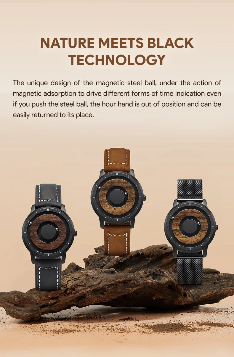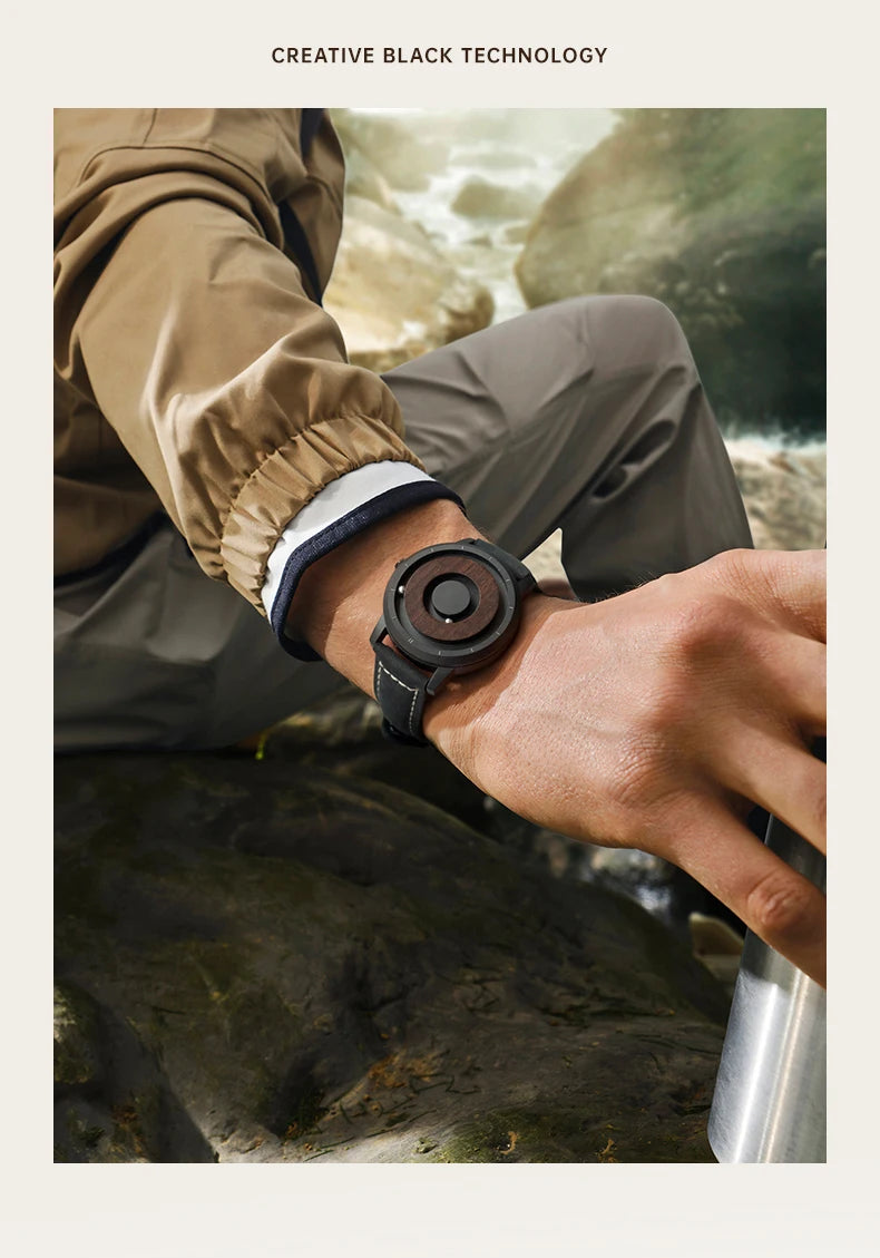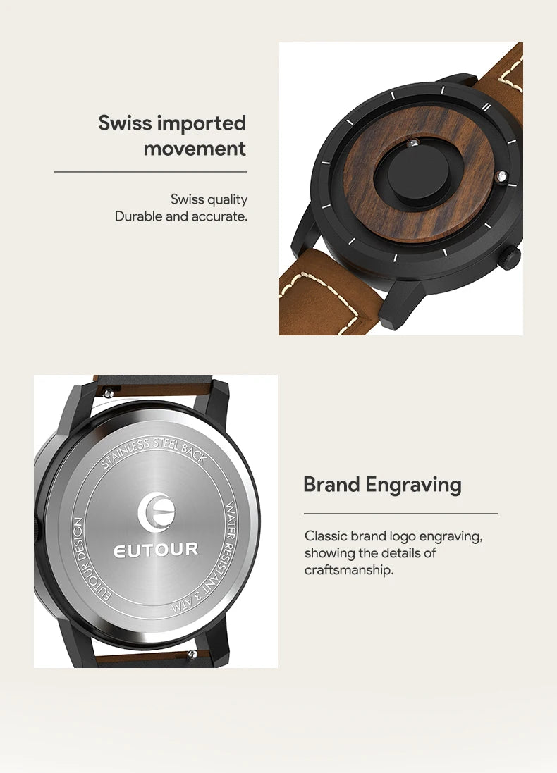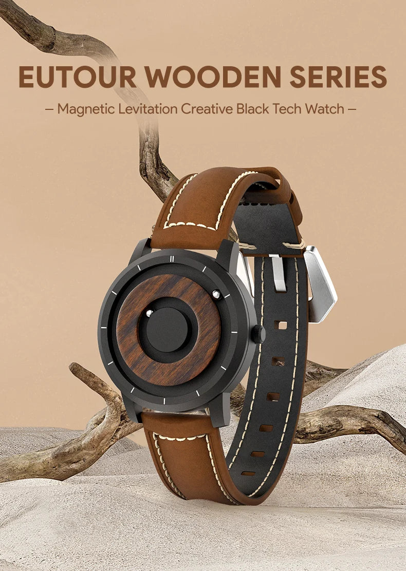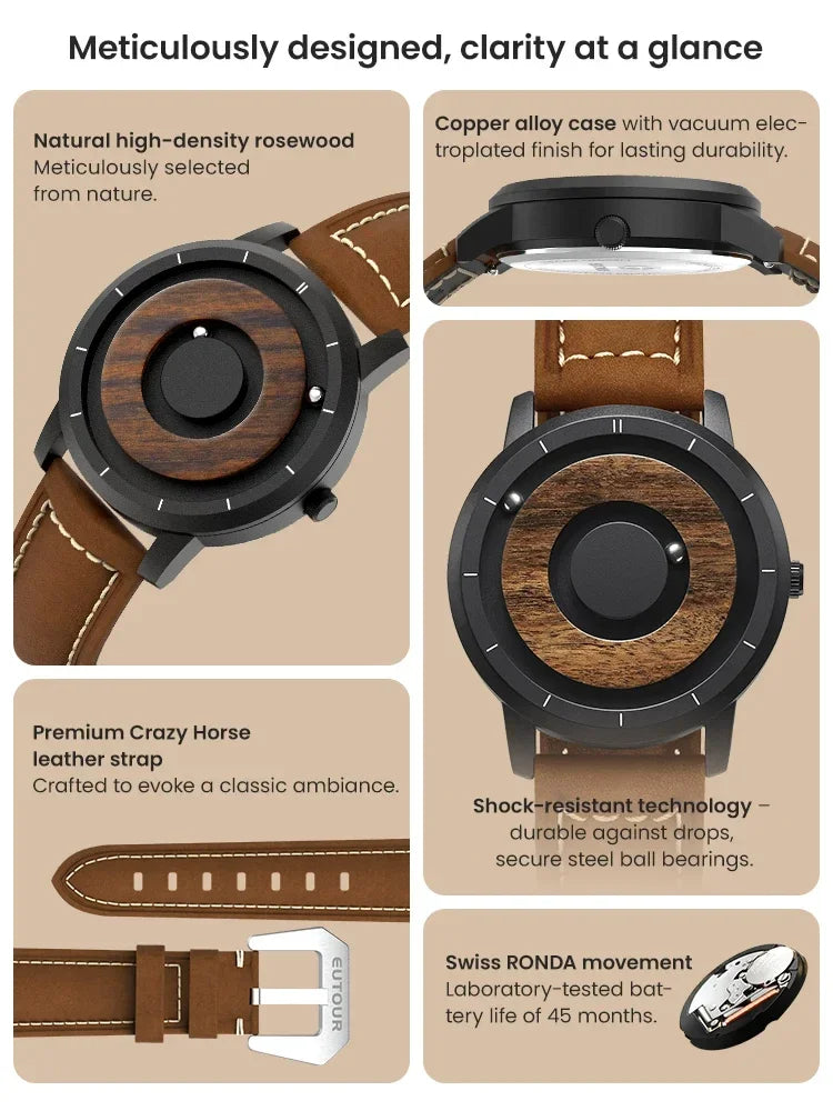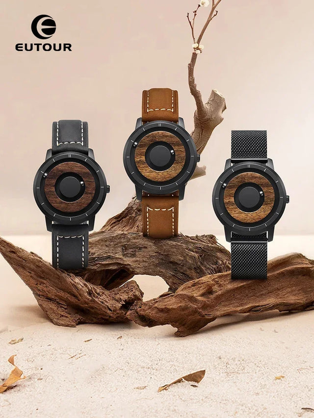 EUTOUR 2025 nieuw origineel magnetische houten wijzerplaat mode casual quartz horloge eenvoudig herenhorloge roestvrij stalen leren band