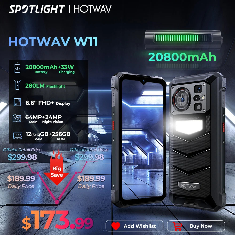 [Wereldpremière] HOTWAV W11 robuuste telefoon 20800mAh 280LM zaklamp 6,6'' FHD+ smartphone 33W 24MP nacht...