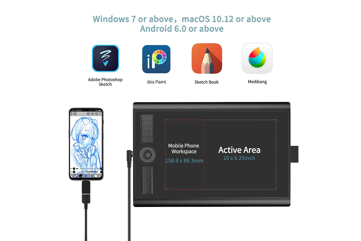 De M10K PRO is compatibel met Android OS 6.0 of hoger. Verbind de tablet met je Android-telefoon/tablet via een OTG-adapter en we kunnen direct aan de slag met het maken van kunst.