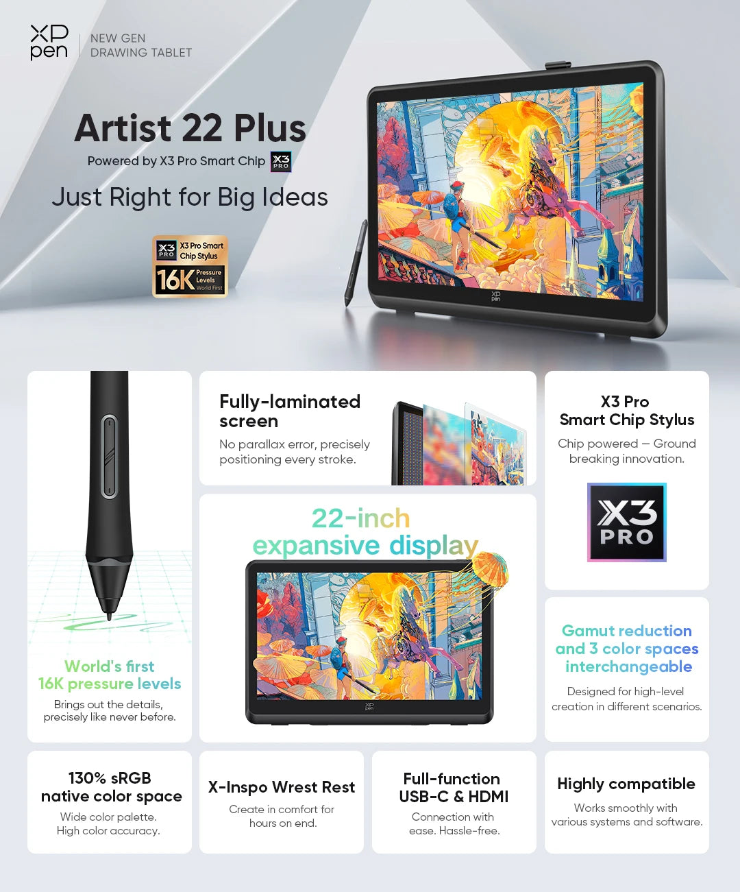 XPPen Artist 22 Plus grafische tabletmonitor met 16K drukniveaus X3 Pro Smart Stylus 22 inch, 130% sRGB v...
