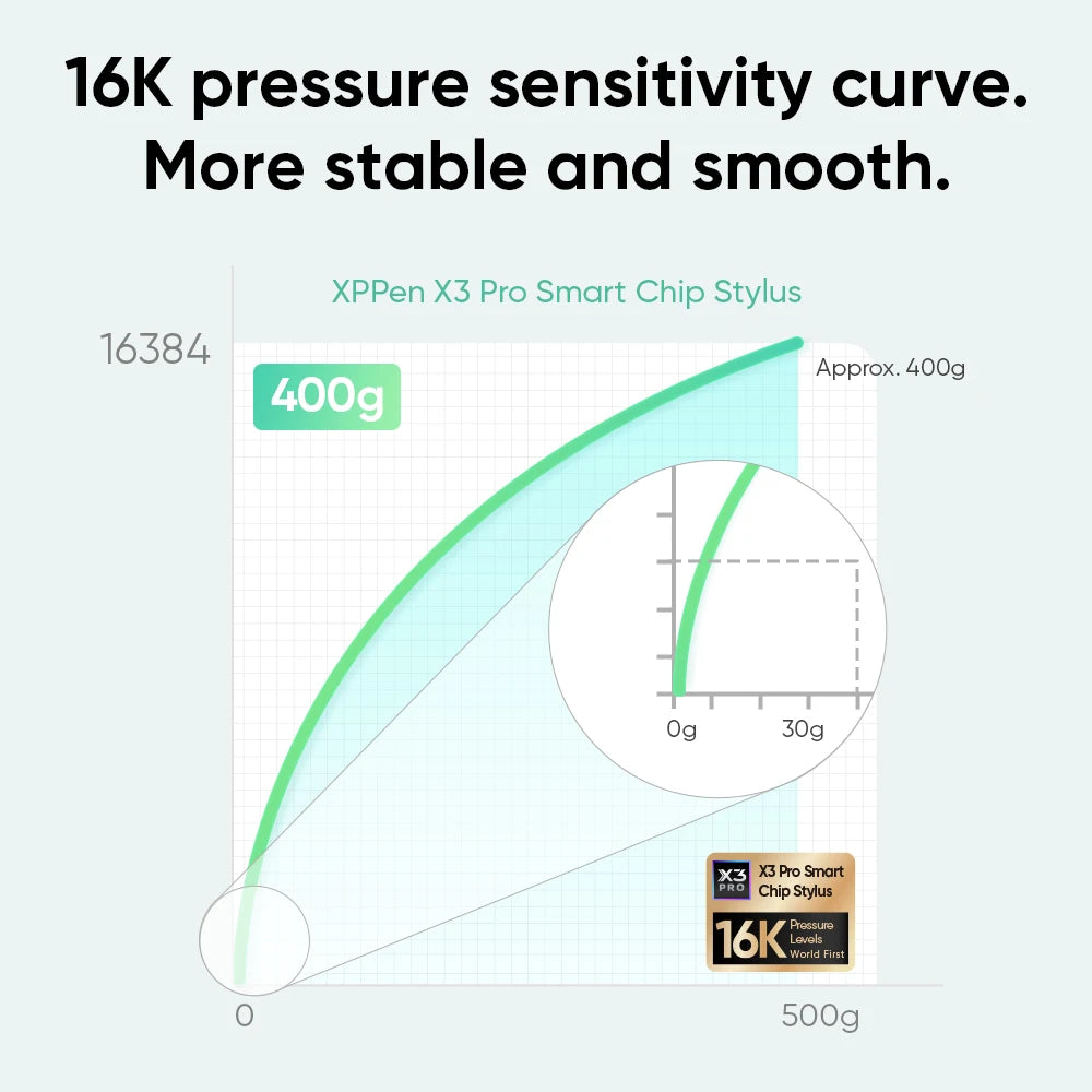 Zoals de grafiek laat zien, vertoont de drukgevoeligheidscurve van de X3 Pro Smart Chip Stylus een geleidelijke stijging en een fijnere drukovergang.