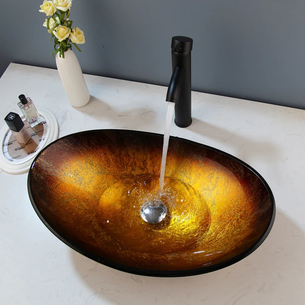 KEMAIDI Badkamer Gehard Glazen Wastafel Ovale Glazen Wastafel met Watervalkraan Bootvormige Wastafel Bove...