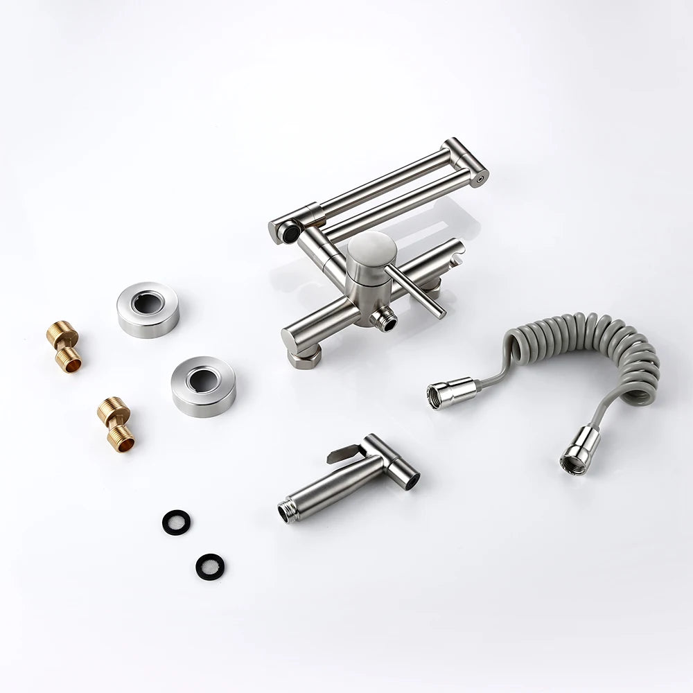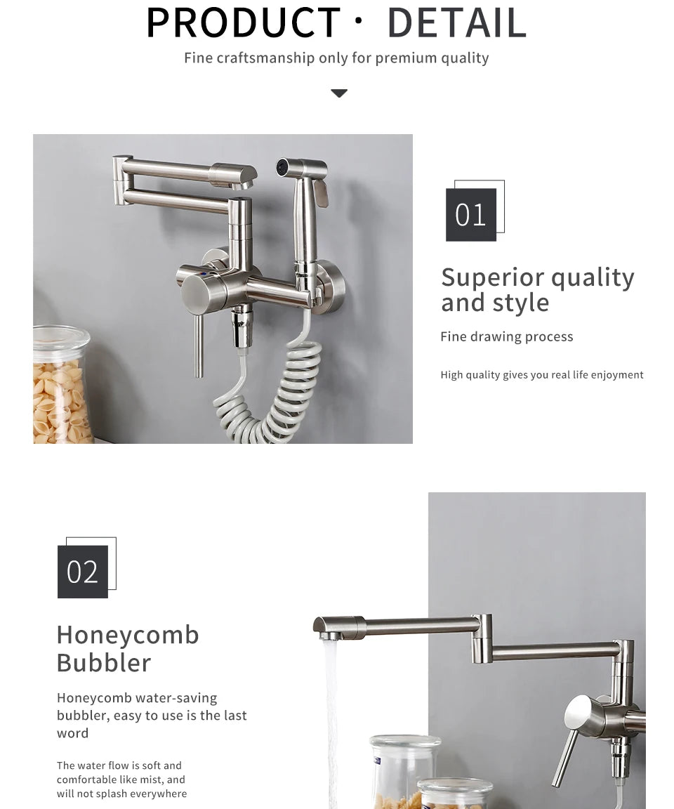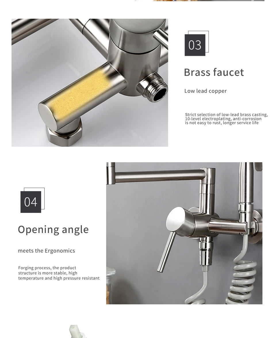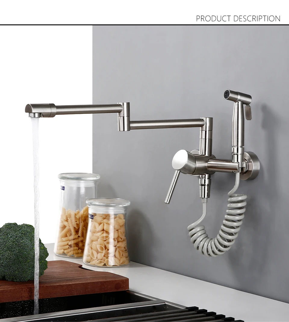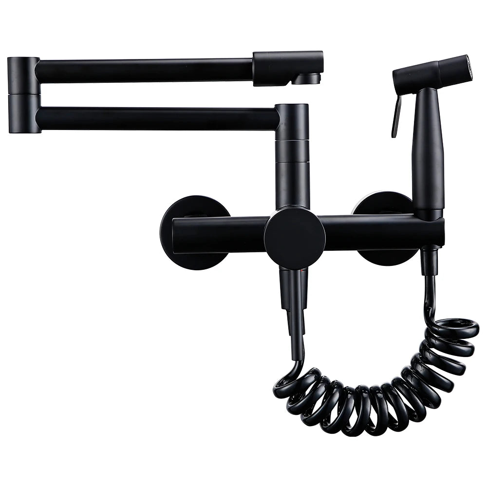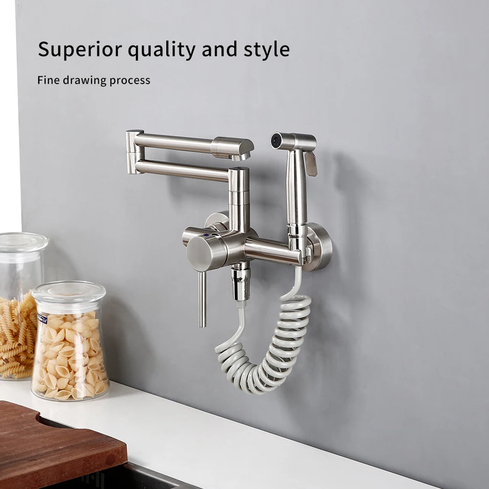Keukenmengkraan met sproeier, warme en koude straal, wandmontage, potvuller, uittrekbare tweegatskraan, g...