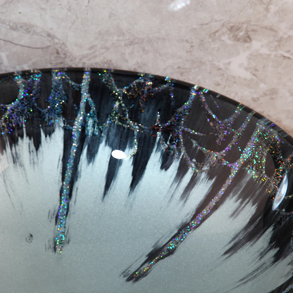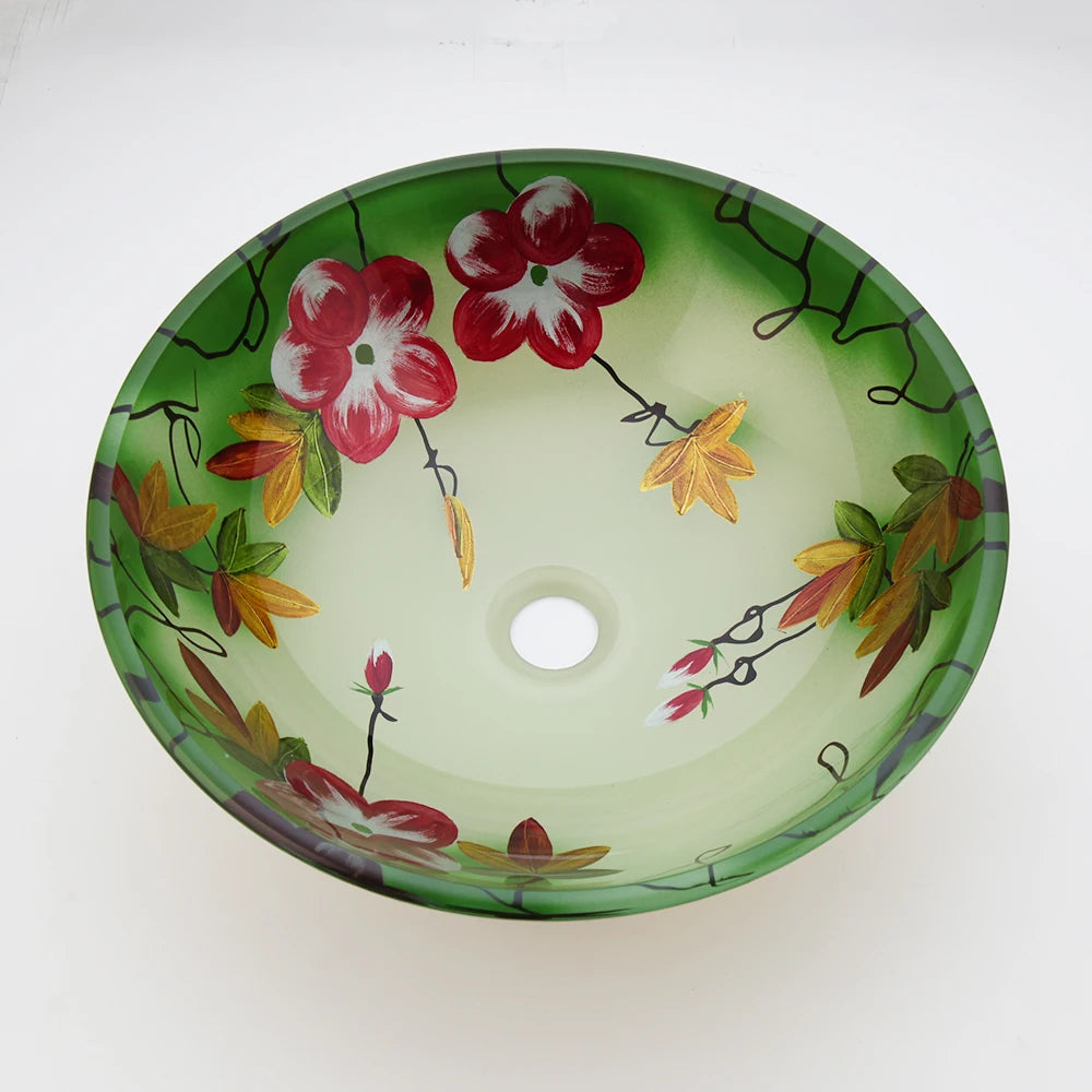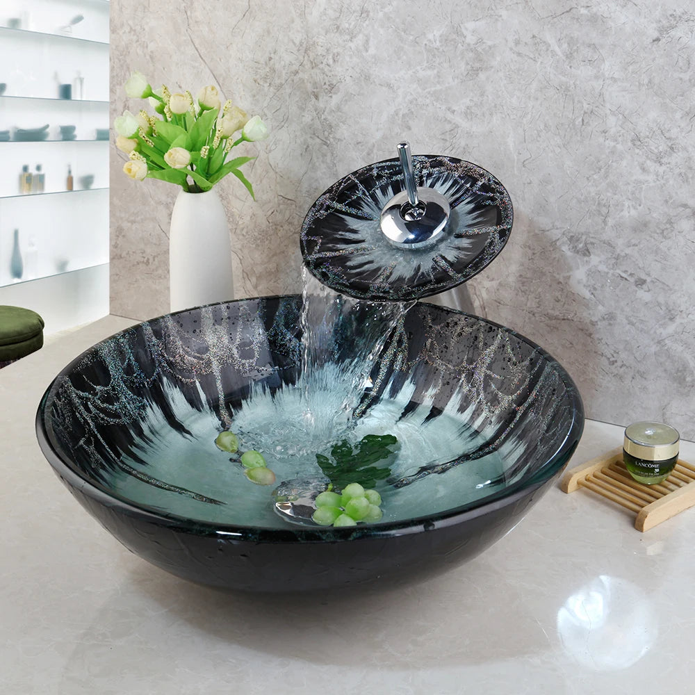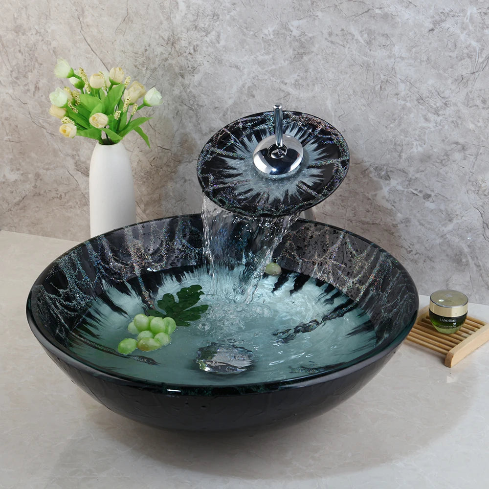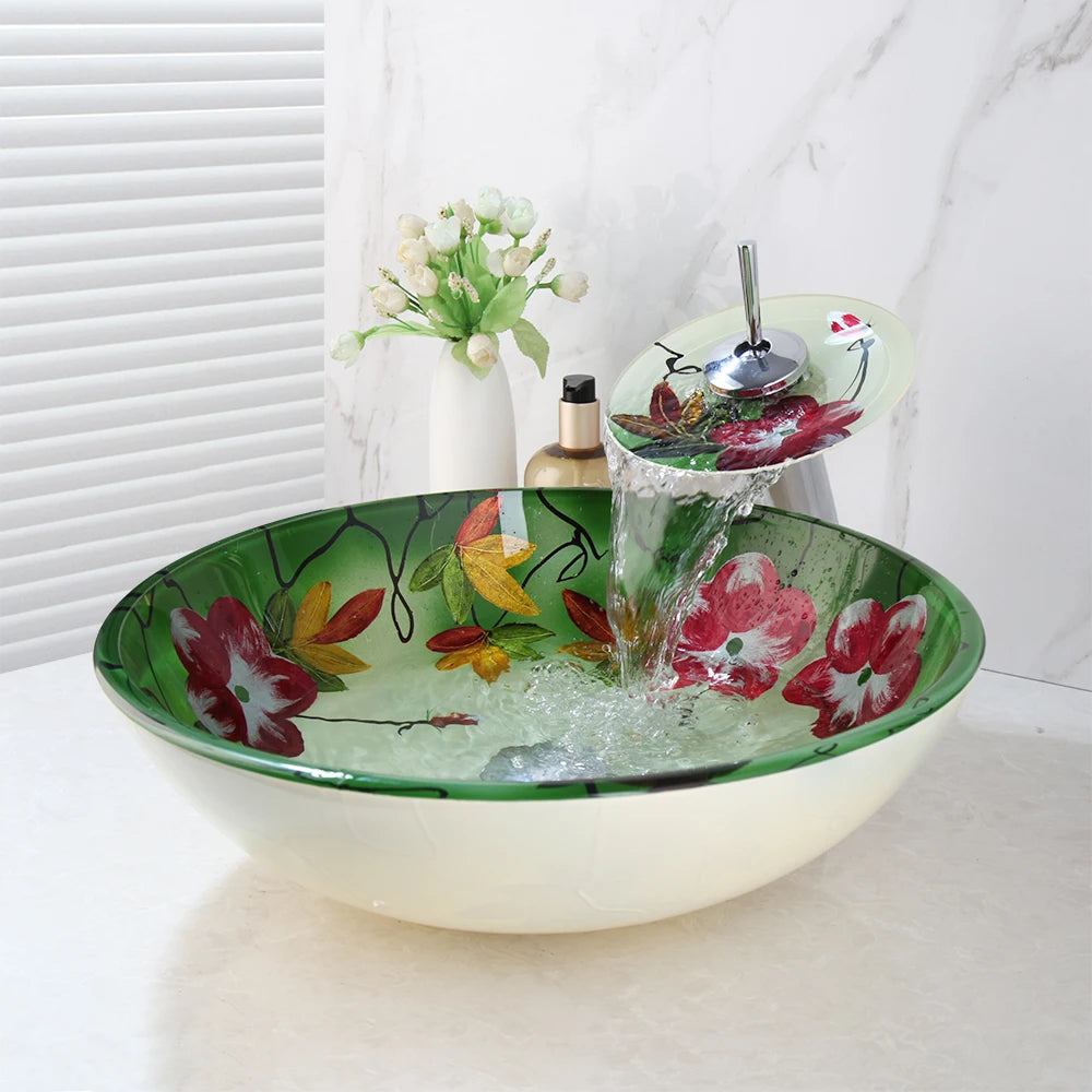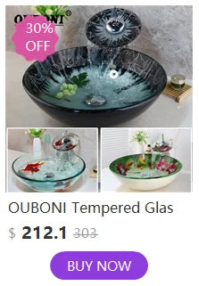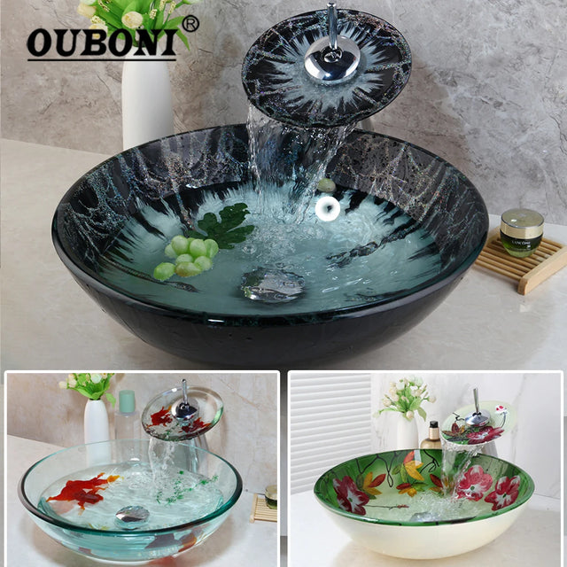 OUBONI Gehard glazen badkamer wastafelkraanset, handbeschilderde ronde kunstwastafel met warm-koudmengkra...