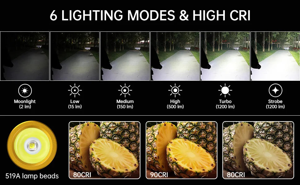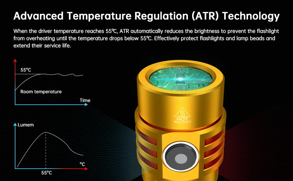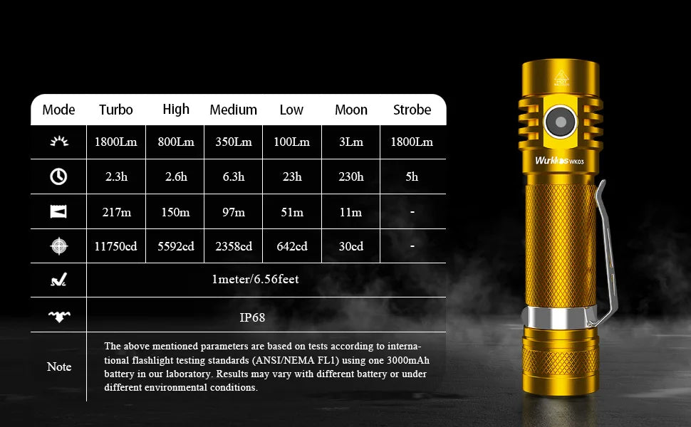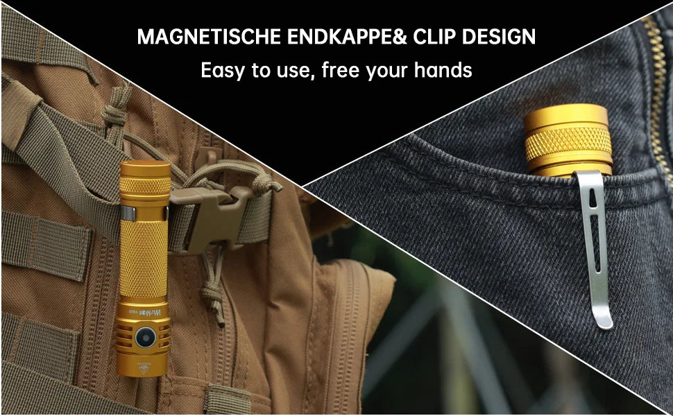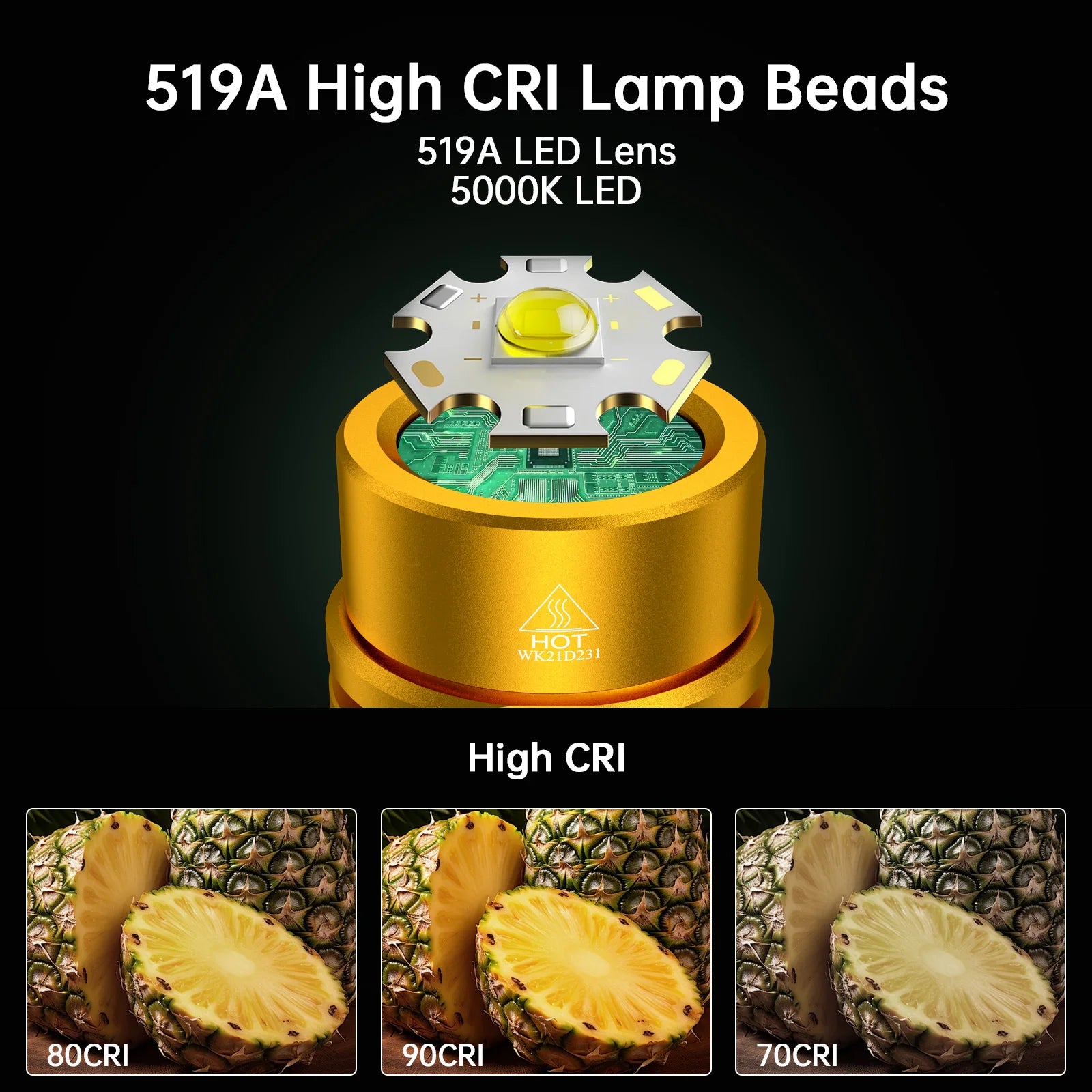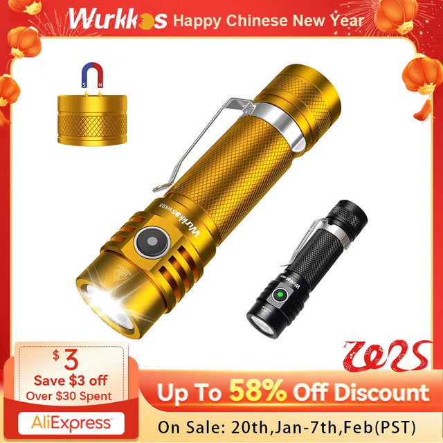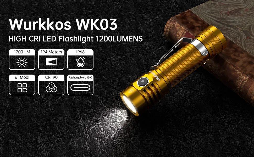 Wurkkos TLF Golden WK03 18650 Zaklamp Nichia 519A 5000K 1200lm USB C Oplaadbaar Extra Magnetische Staartkap