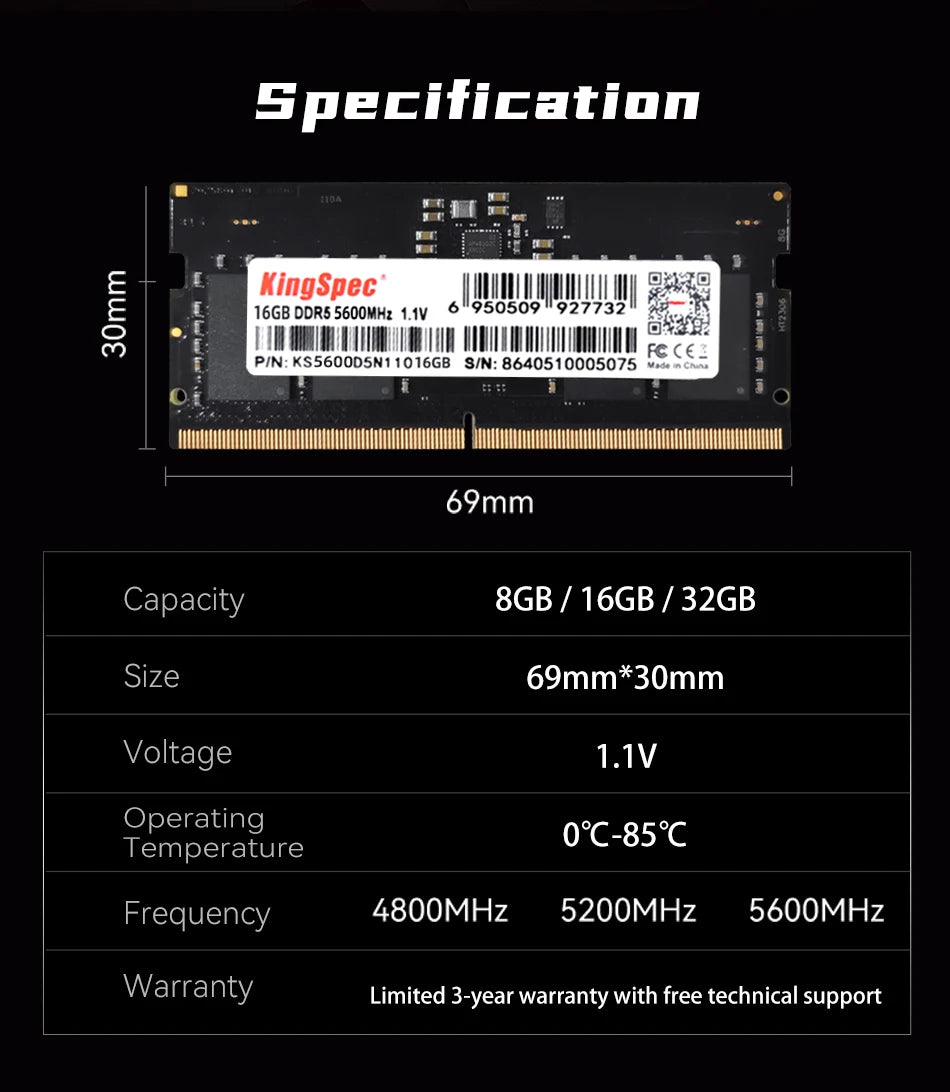 KingSpec RAM 16GB 32GB DDR5-geheugen 4800MHz 5600MHz SODIMM 1.1V CL40 CL46 voor laptop ECC-geheugen DDR4 ...