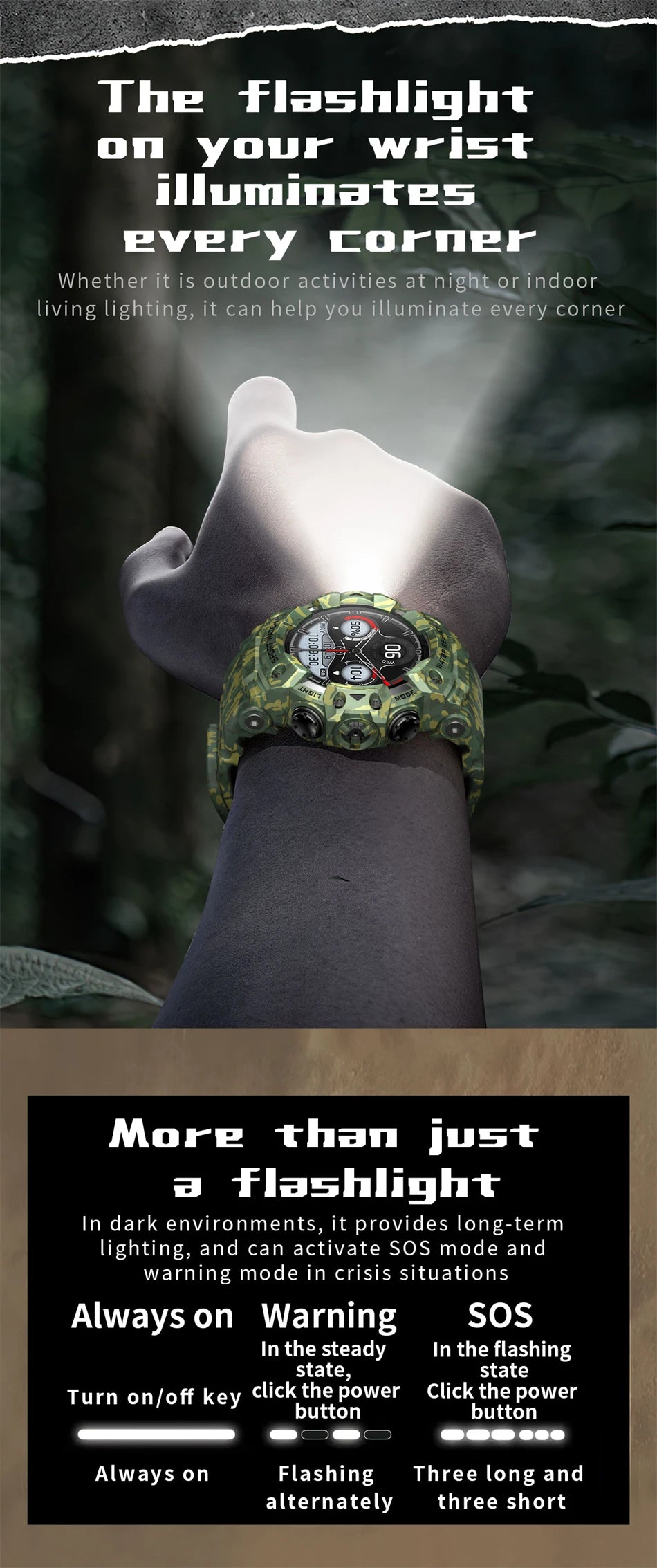 Kenmerken van het horloge 9 : Zaklamp met hoog licht: Ingebouwde, zeer heldere LED-lichtchip, die een sterke lichtopbrengst biedt en zelfs in donkere omgevingen voor voldoende verlichting zorgt, zodat u de weg voor u duidelijk kunt zien.