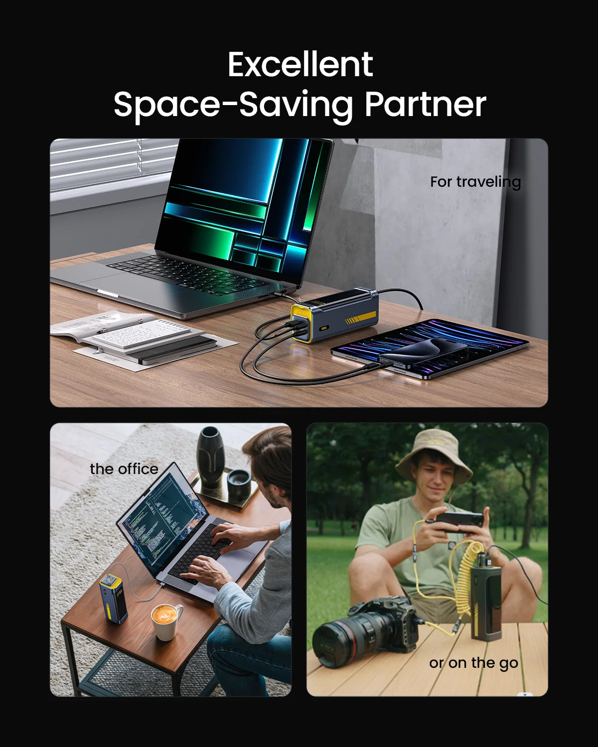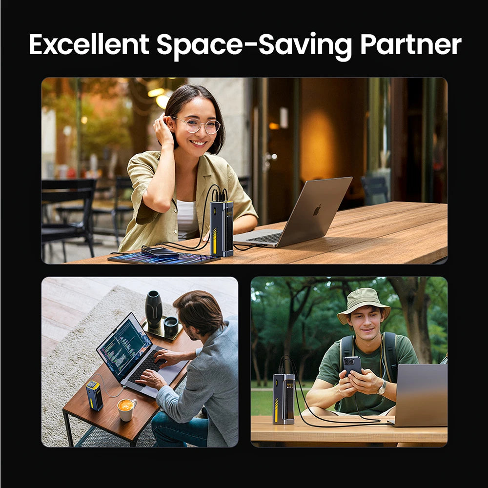 Compact als een blikje (5,3 x 6,5 x 17 cm) en voorzien van drie USB-C 140W-poorten en één USB-A-poort voor uw dagelijkse behoeften, en diverse snellaadopties. Ideaal om apparaten van stroom te voorzien tijdens reizen en woon-werkverkeer, perfect voor professionals die een betrouwbare powerbank voor laptops en een efficiënt laadstation nodig hebben.