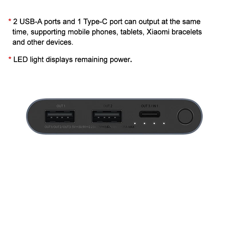 Twee USB-A-poorten en één Type-C-poort kunnen tegelijkertijd output leveren, waardoor meerdere apparaten zoals mobiele telefoons, tablets en Xiaomi-armbanden worden ondersteund.