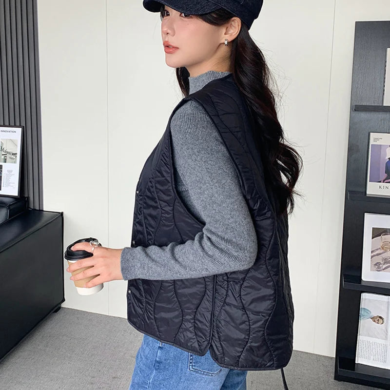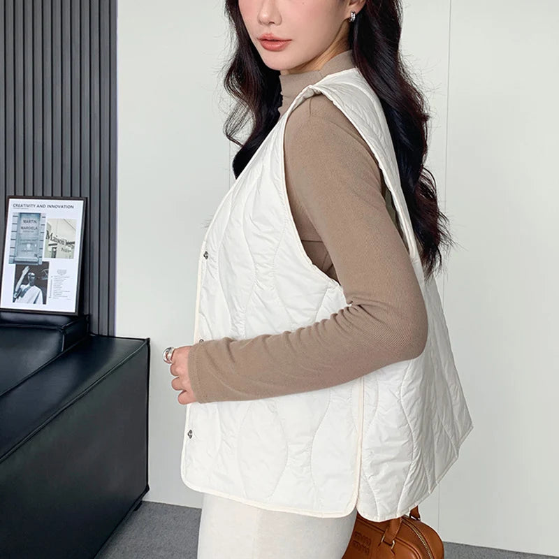 Lichtgewicht katoenen vestjas voor dames, Koreaanse V-hals, warm, mouwloos