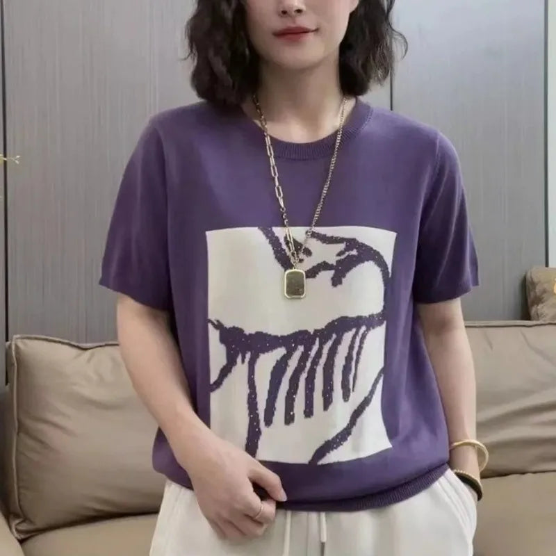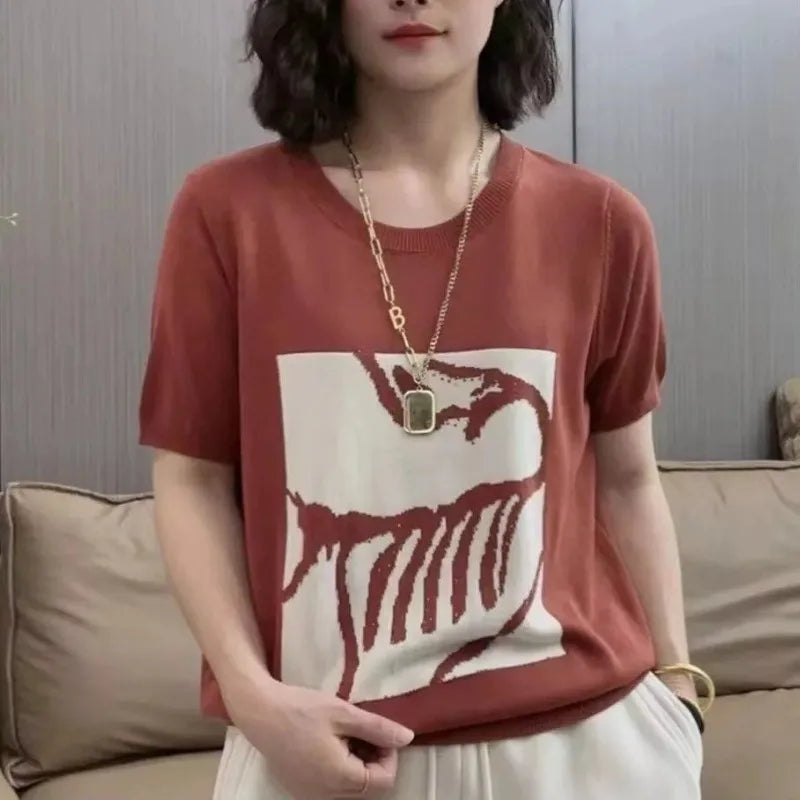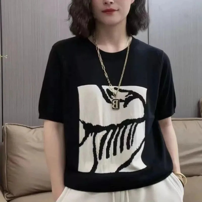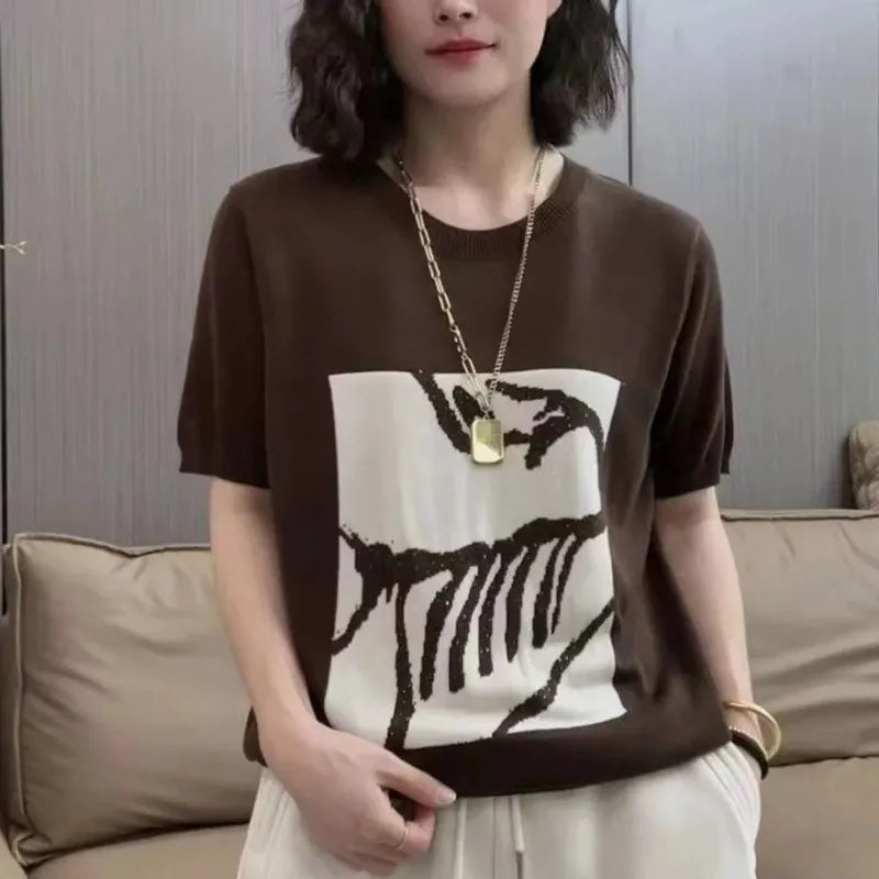 Dameskleding Zomer Geometrische Ronde Hals Trui Korte Mouw Dun