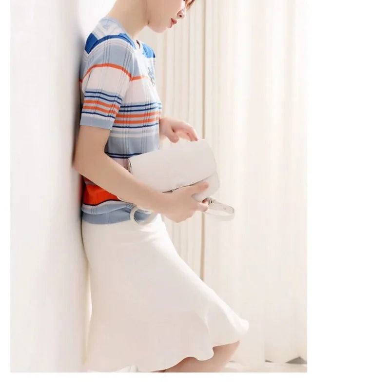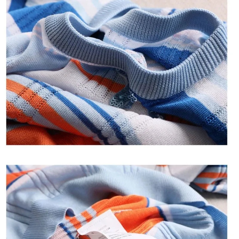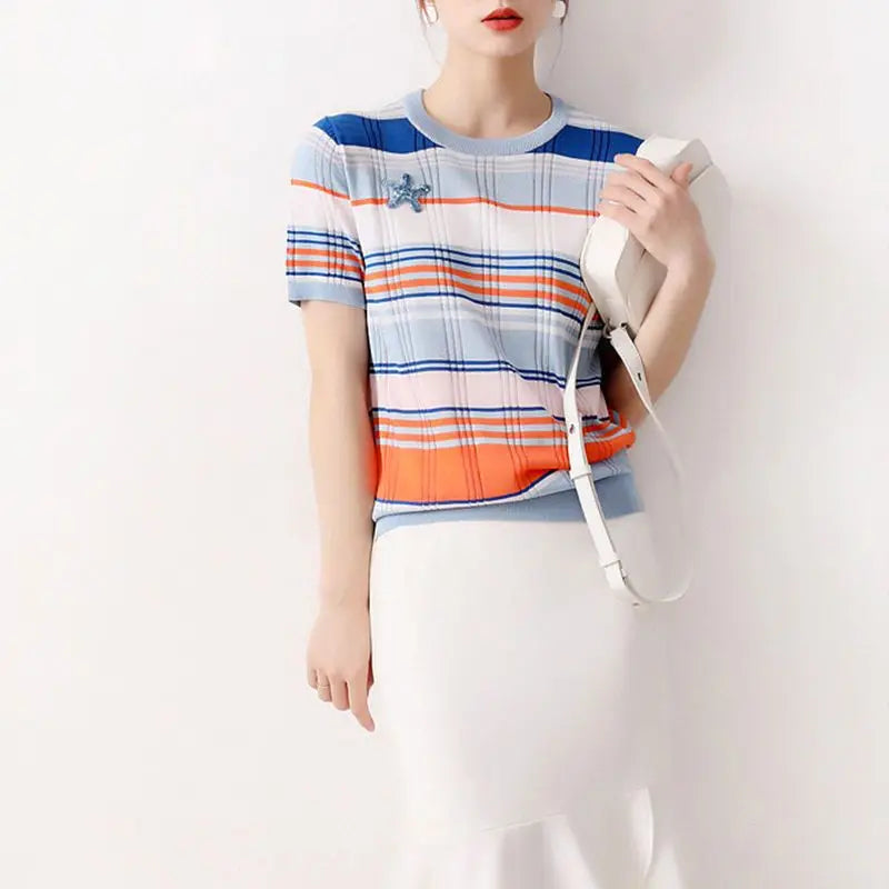 Dameskleding Zomer Korte Mouw Pailletten Ronde Hals Trui Gestreepte Trui