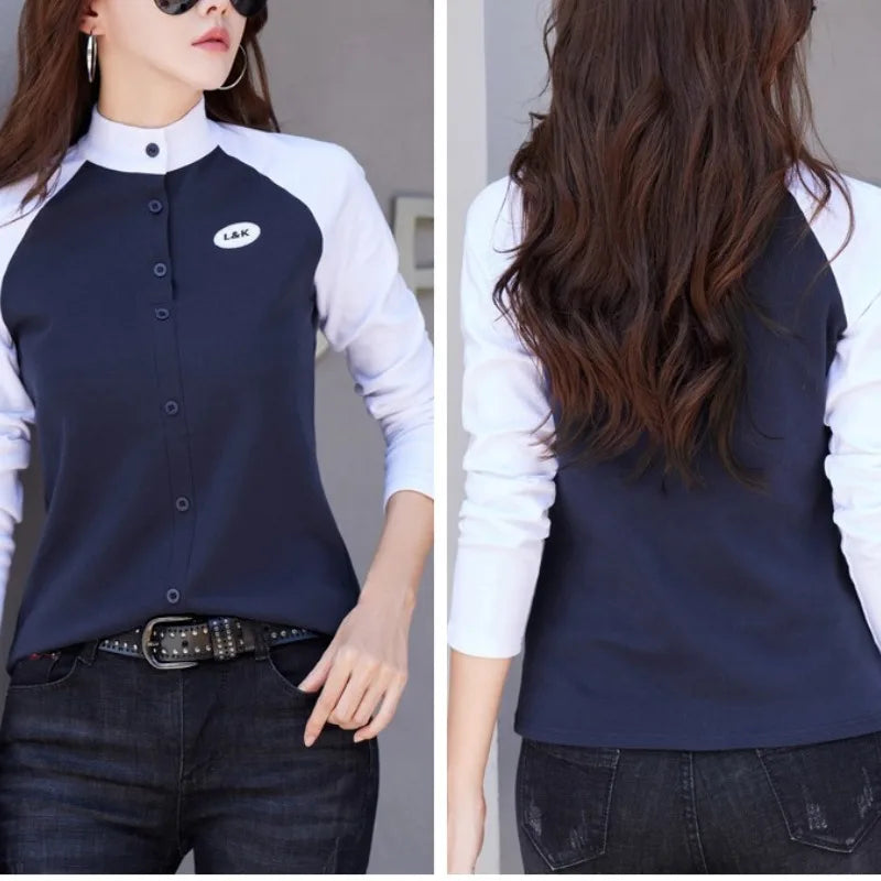 Herfst- en wintertrui voor dames, opstaande hals, knoopsluiting, contrastpane...