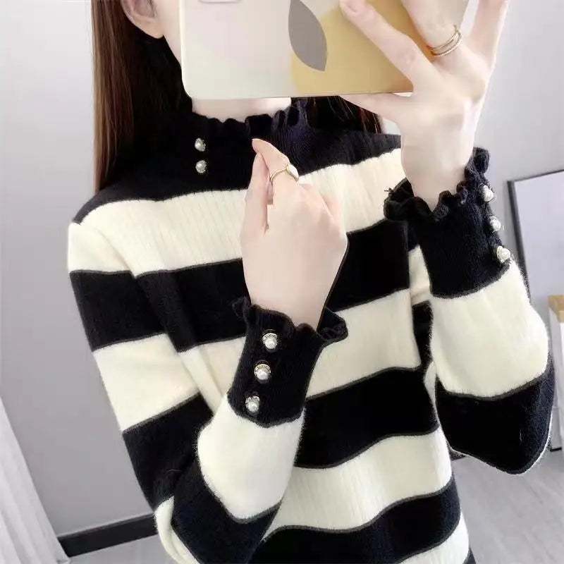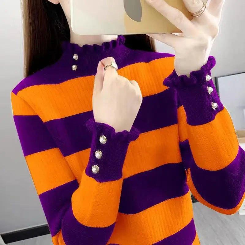 Herfst Winter Contrasterende Kleur Halfhoge Kraag Gestreepte Knoop Lange Mouw