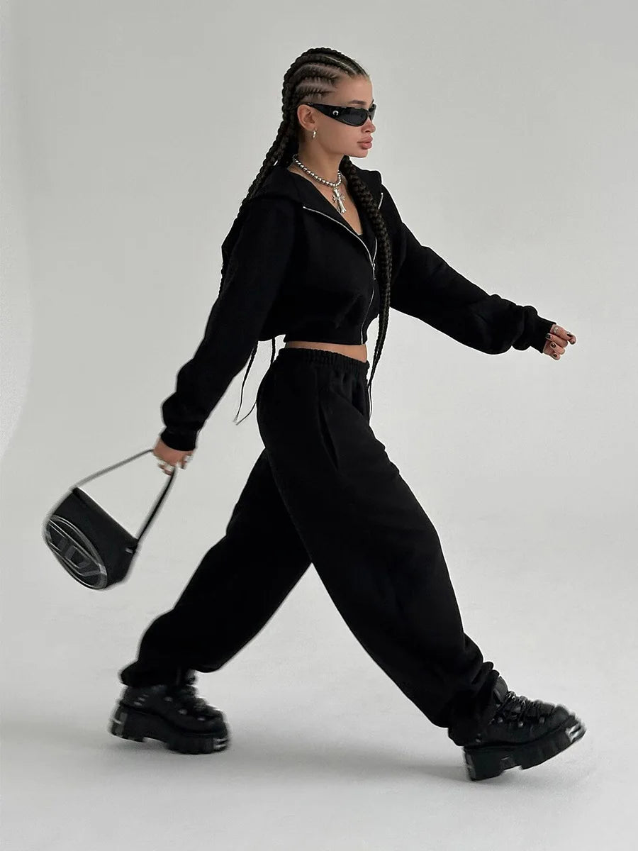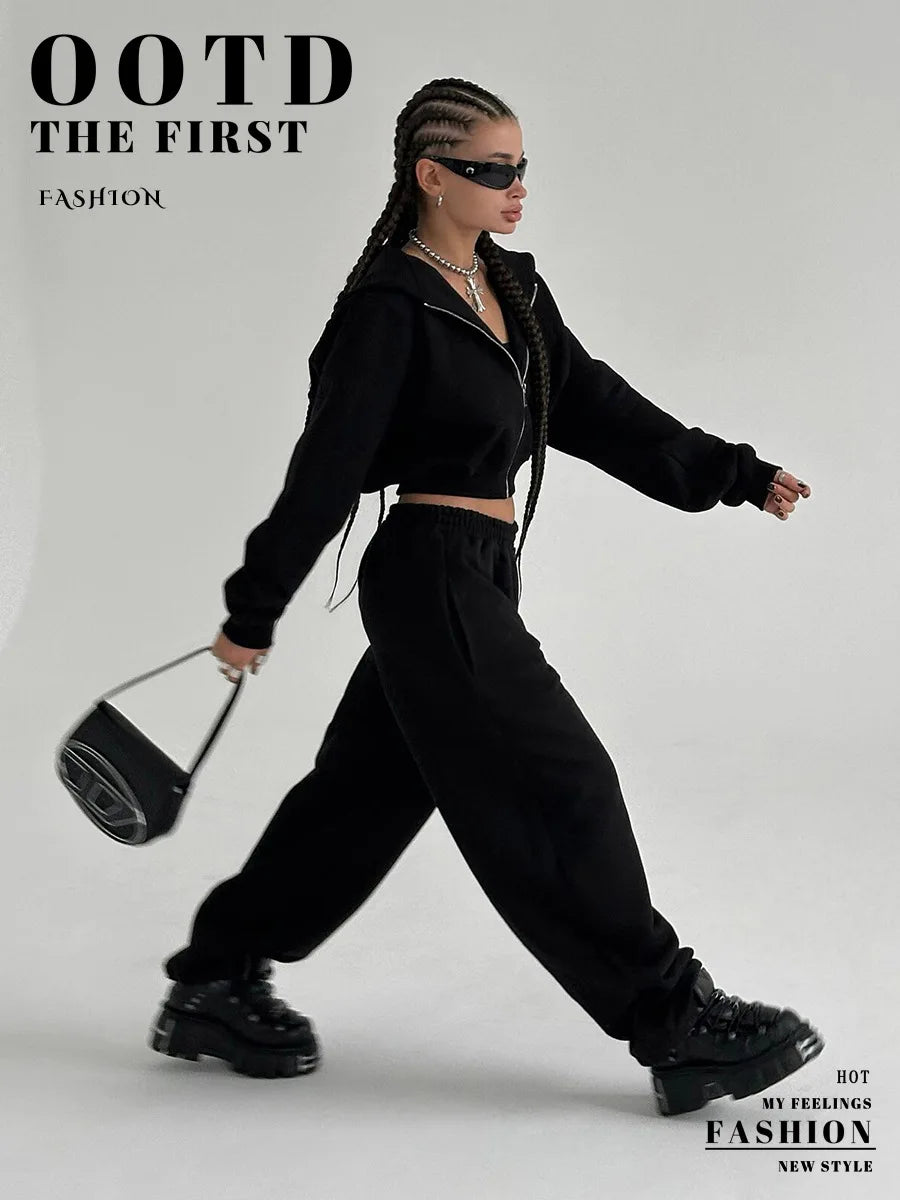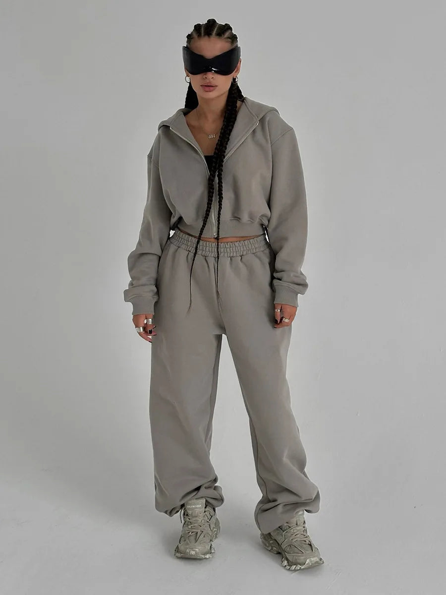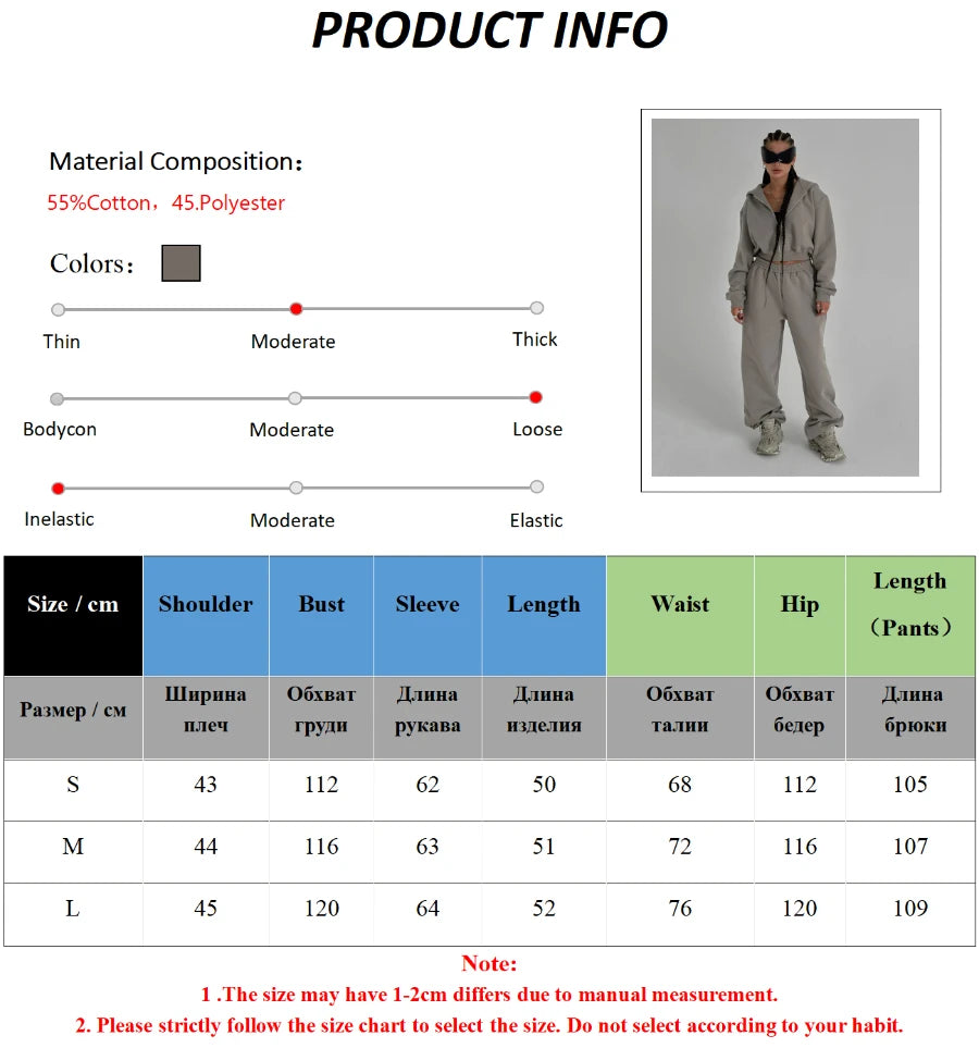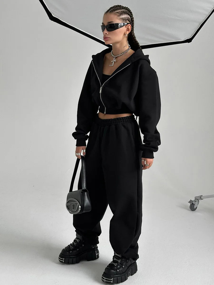 Bornladies Dames Cropped Hoodie Sweatpants Set Losse Trekkoord Taille Ritsslu...