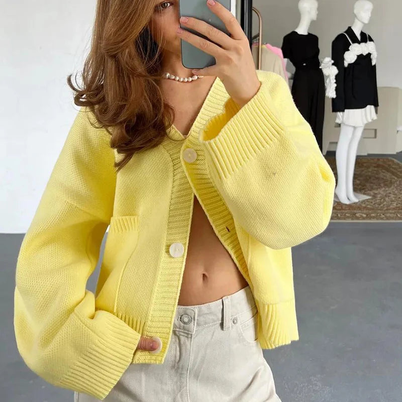 Gele gebreide single-breasted cardigan voor dames, lente/herfst, losse V-hals