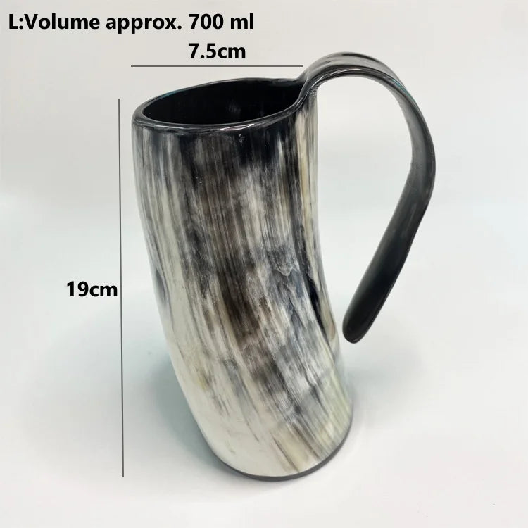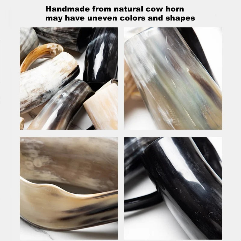 #Dit product is gemaakt van ruw ossenhoorn en het handvat is geïntegreerd. De originele kleur van het hoorn is zwart-wit, de kleur is verschillend in tinten en de beker is rond. Het originele hoorn is gesneden, maar daardoor zijn ze niet allemaal precies hetzelfde.