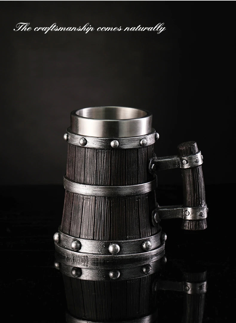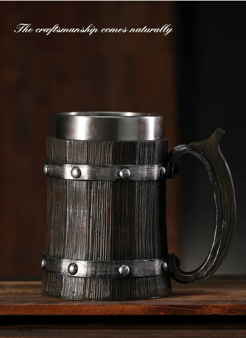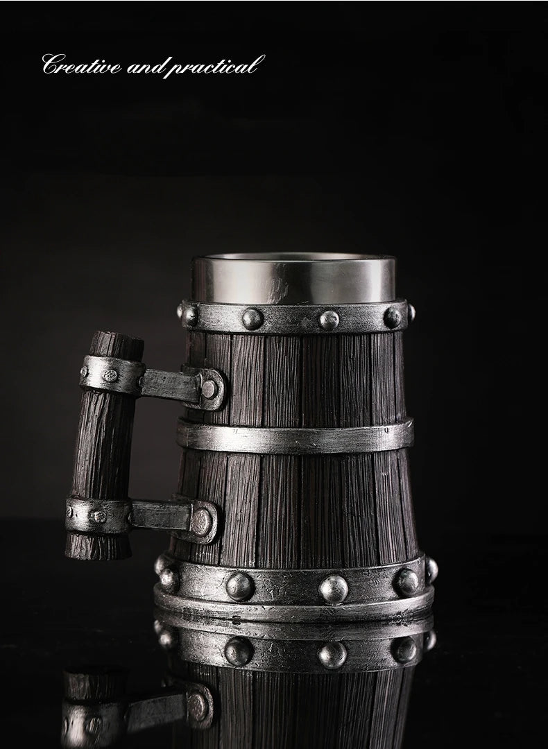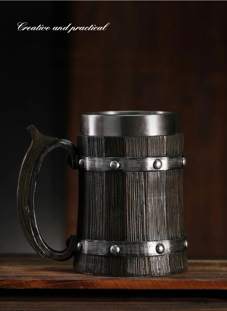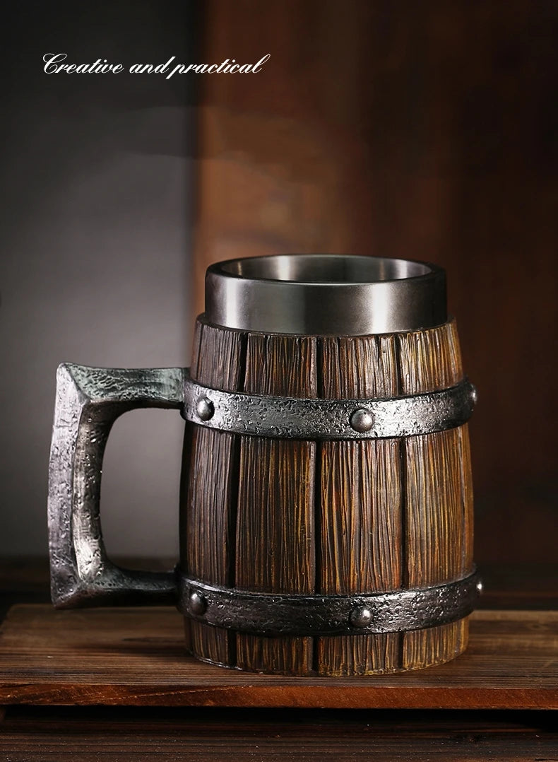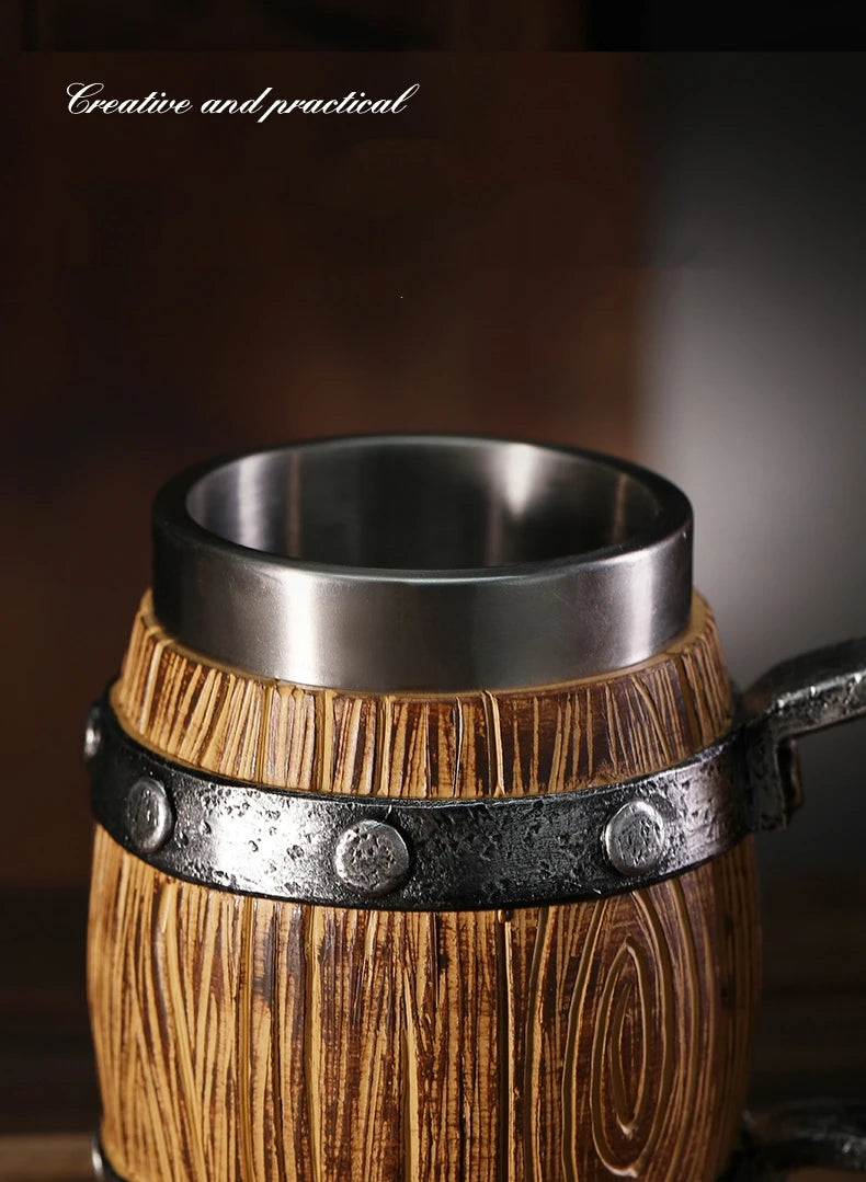 Viking houten stijl bierpul 3D hars roestvrij staal koffiekopje wijnglas metalen dubbelwandige mok bierka...
