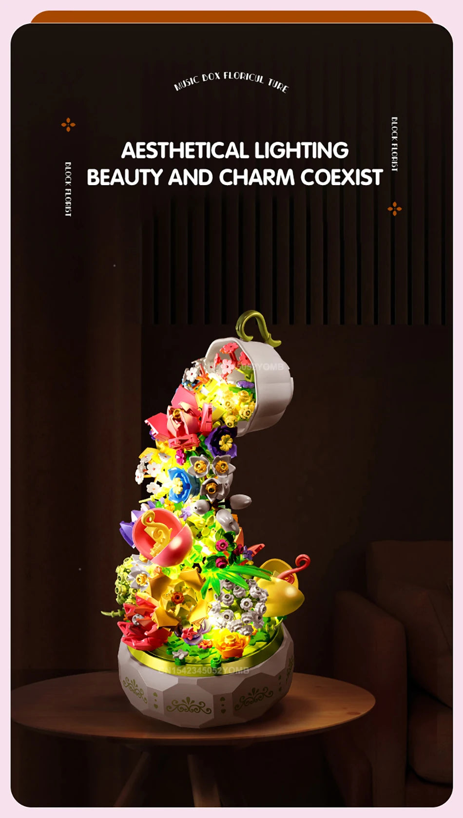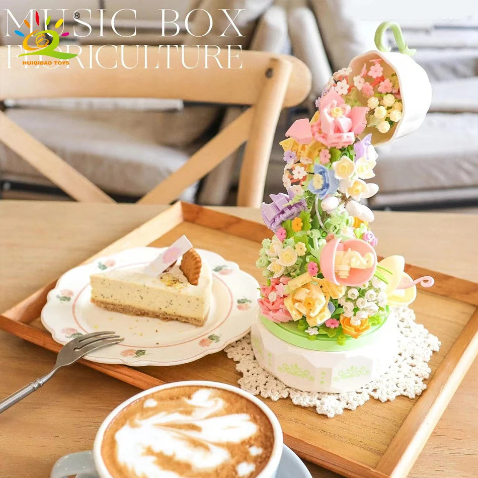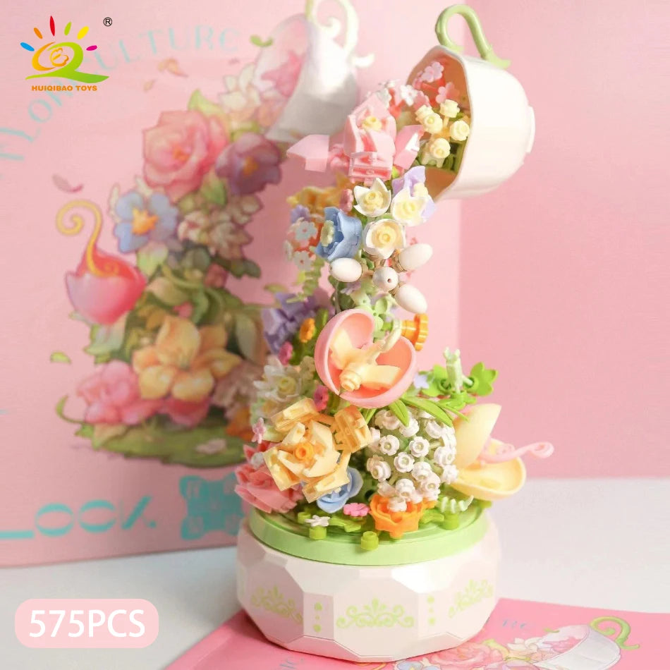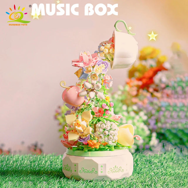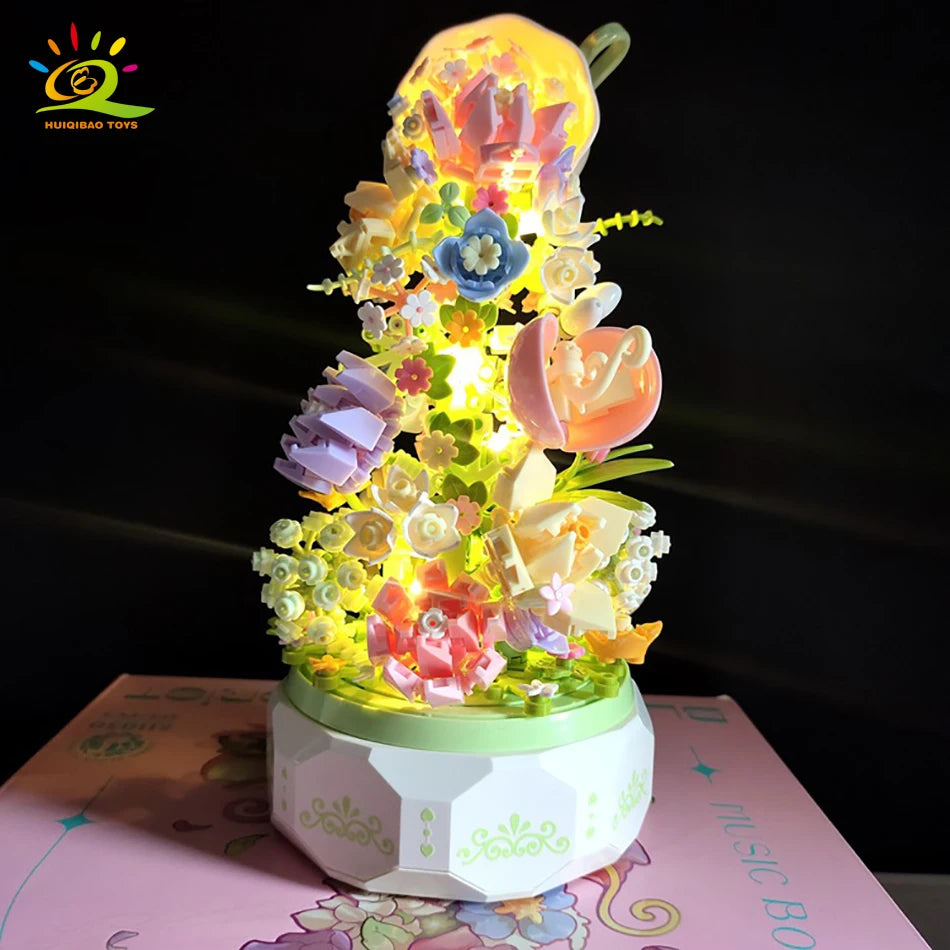 HUIQIBAO 575PCS Romantische Bloem Verlichting Muziekdoos Bouwstenen Woondecoratie Anime Creatief Speelgoed Kind Volwassenen Kerstcadeaus