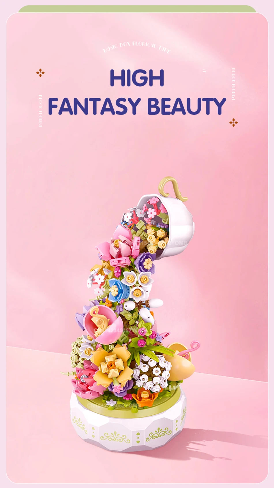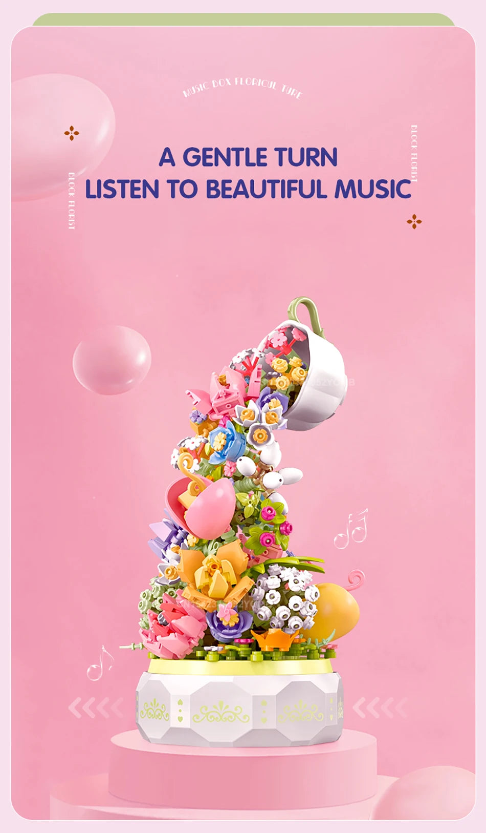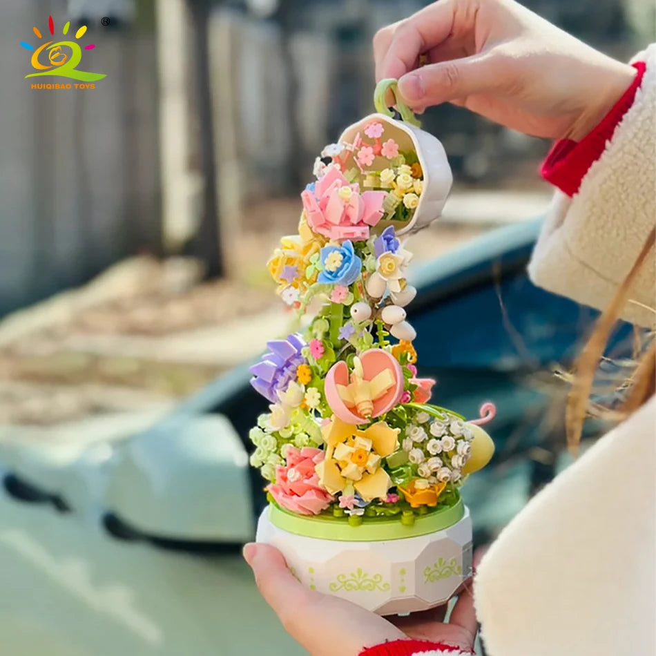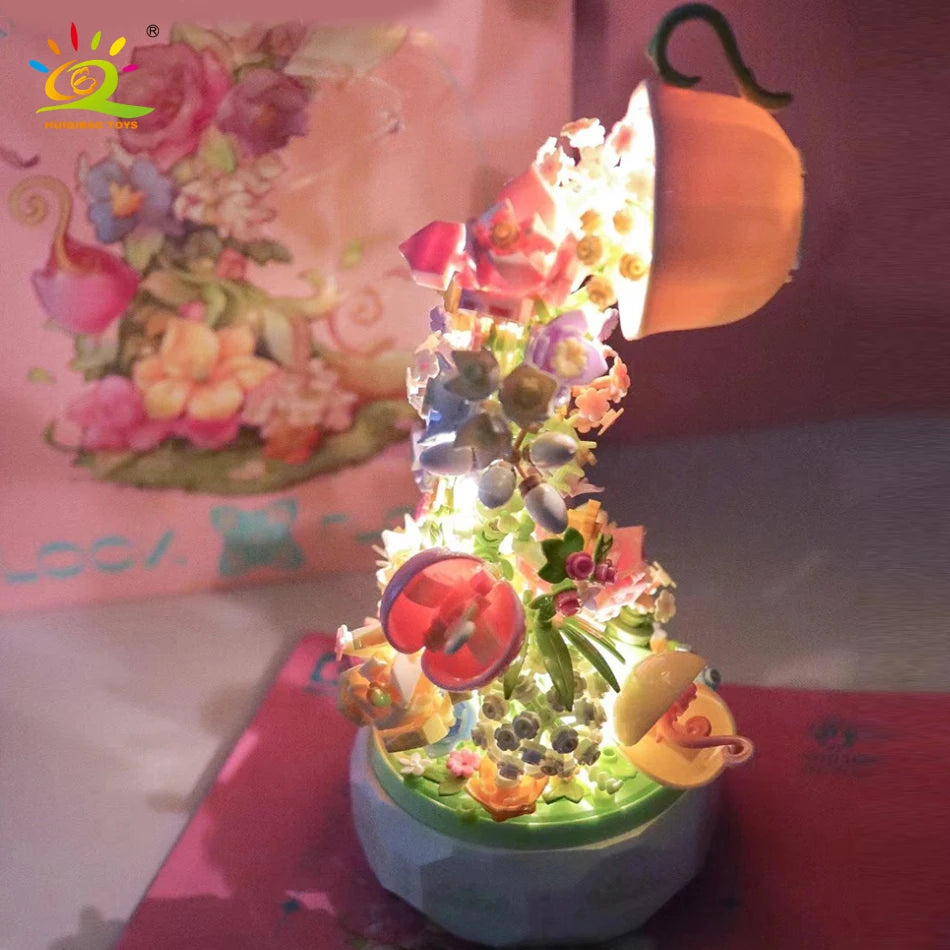 HUIQIBAO 575PCS Romantische Bloem Verlichting Muziekdoos Bouwstenen Woondecoratie Anime Creatief Speelgoed Kind Volwassenen Kerstcadeaus