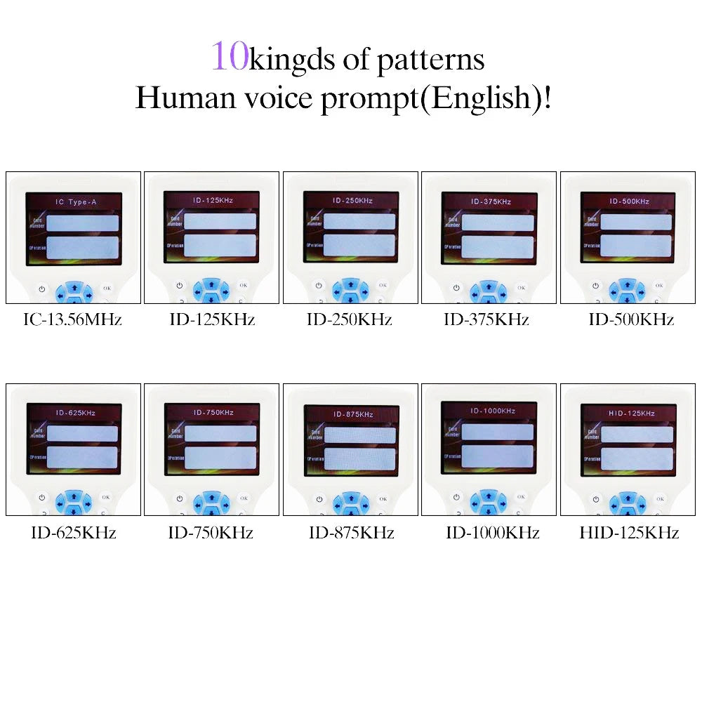 Let op: Deze machine ondersteunt alleen lezen en kopiëren van 125 kHz, 250 kHz, 375 kHz, 500 kHz, 625 kHz, 750 kHz, 875 kHz, 1M, HID-125 kHz, 13,56 MHz (IC-modus), decodering van de meeste IC-encryptiekaarten (maar niet alle), geen kopieer-CUID- en FUID-chipkaarten, en geen kaarten met voeding. Niet alle chips worden ondersteund, omdat elk bedrijf wereldwijd zijn eigen chiptype kan aanpassen. Als uw sleutels of kaarten niet door het apparaat kunnen worden gelezen of beschreven, kan dit komen doordat de sleutels of kaarten van een niet-ondersteund type zijn.