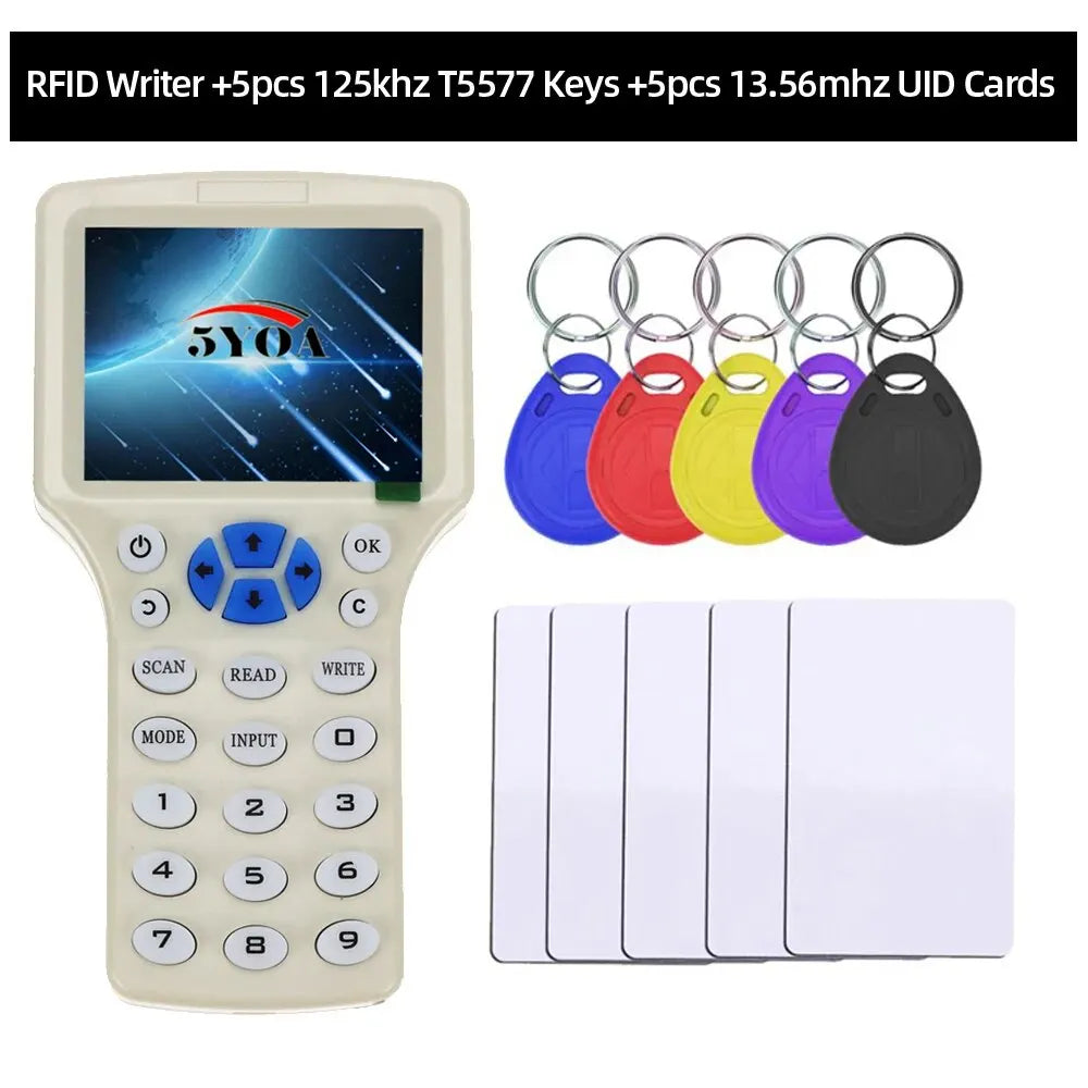 Optie "5KeyT57-5CardUID" is met IDICW01 RFID-lezer en 5 stuks 125khz T5577-sleutelhangers die herschrijfbaar zijn en 5 stuks 13,56mhz UID-kaarten die herschrijfbaar zijn;