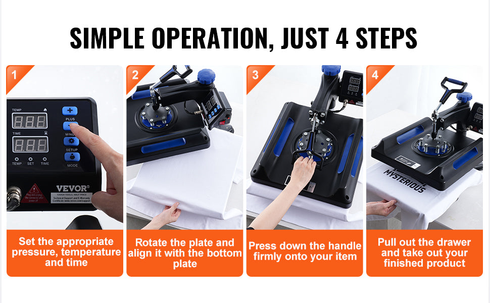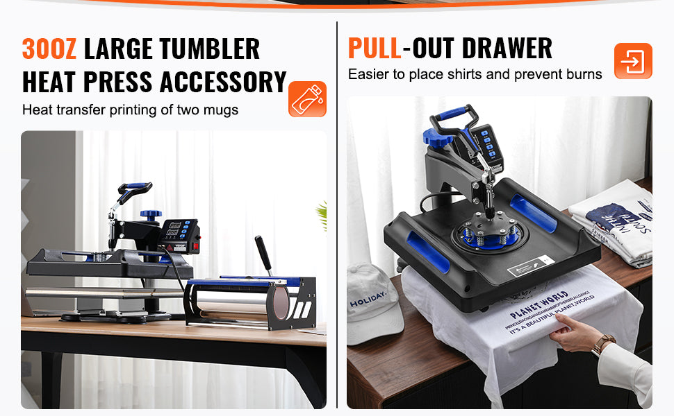 • Eenvoudige bediening: plaatsen, aandrukken en verwijderen – voltooi de transfer in eenvoudige stappen, zelfs als u een beginner bent. Nadat de transfer is voltooid, kunt u dankzij het unieke uittrekbare ladeontwerp van onze warmtetransfermachine het eindproduct eenvoudig verwijderen zonder u zorgen te maken over brandwonden.