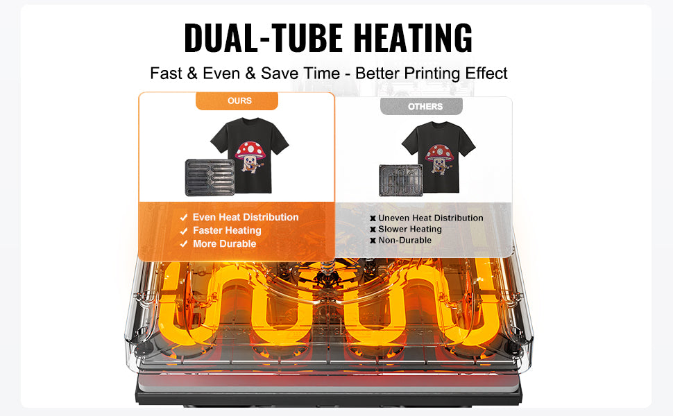 • Dubbele buisverwarming: De shirtpers maakt gebruik van geavanceerde dubbele buisverwarmingstechnologie voor snelle verwarming en een gelijkmatigere warmteverdeling, waardoor elke centimeter van het persoppervlak de ideale temperatuur bereikt. Dit verbetert de uniformiteit, helderheid en kleurechtheid van de overgebrachte ontwerpen.