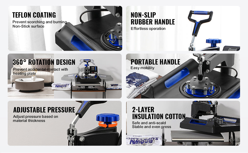 • Verbeterde veiligheid tegen brandwonden: Bij het plaatsen of verwijderen van T-shirts kunt u de 360° wegzwenkbare arm gebruiken om de verwarmingsplaat opzij te schuiven en de lade uit te trekken. Deze veiligheidsvoorzieningen houden u uit de buurt van de verwarmingsplaat en voorkomen brandwonden. Het uitschuifbare ontwerp biedt meer ruimte voor eenvoudige en comfortabele bediening. De tefloncoating is gemakkelijk te reinigen, voorkomt aanbranden en zorgt voor stabielere afdrukken.