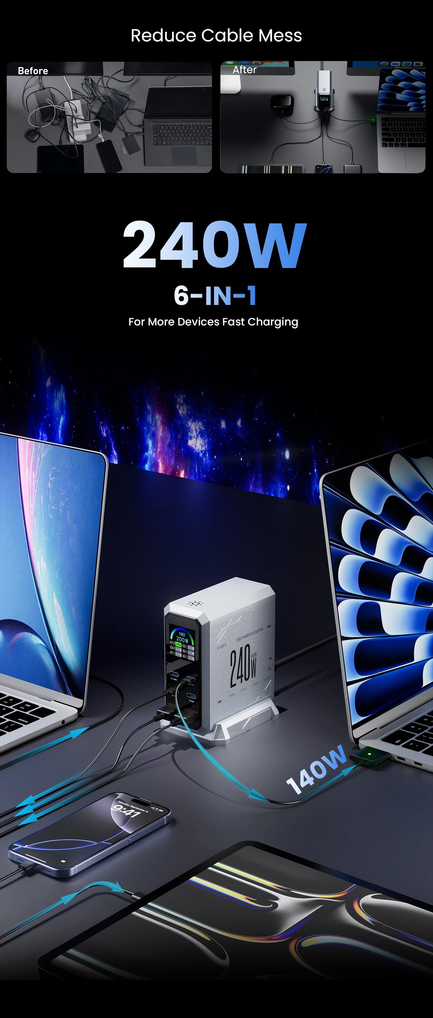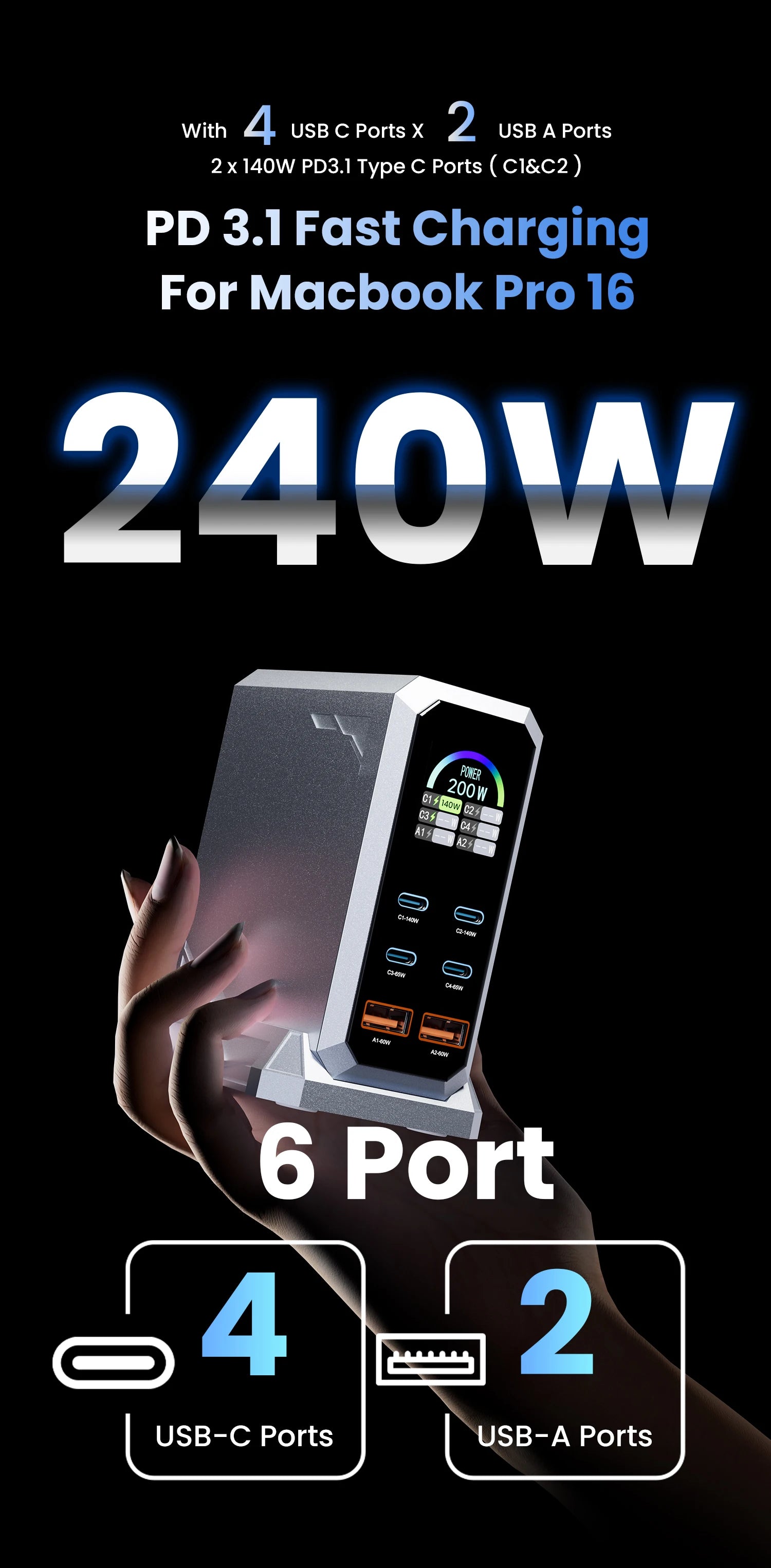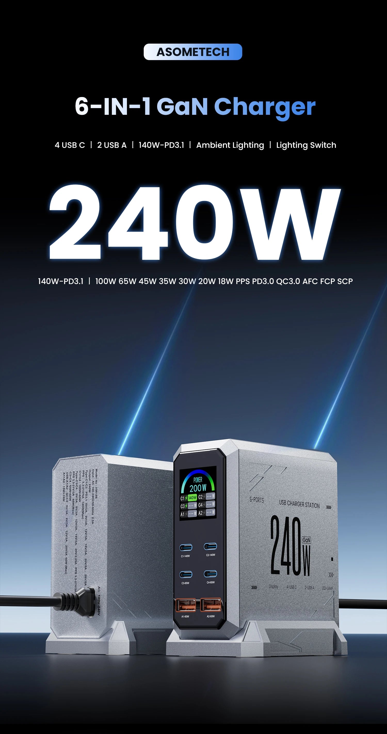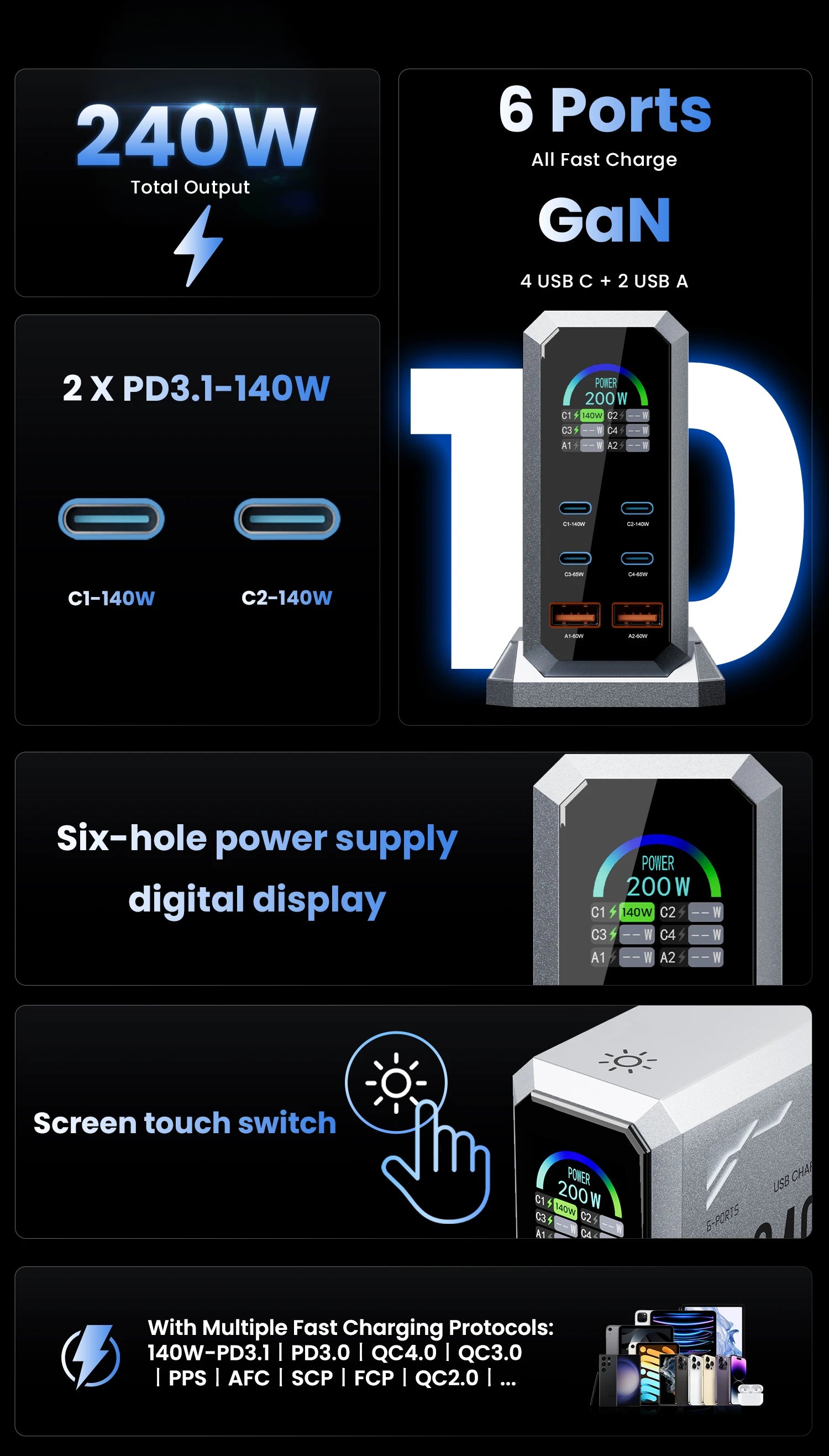 240w GaN Charger Pd3.1 140w USB Type C 6 Ports PPS PD Desktop Fast Charging
