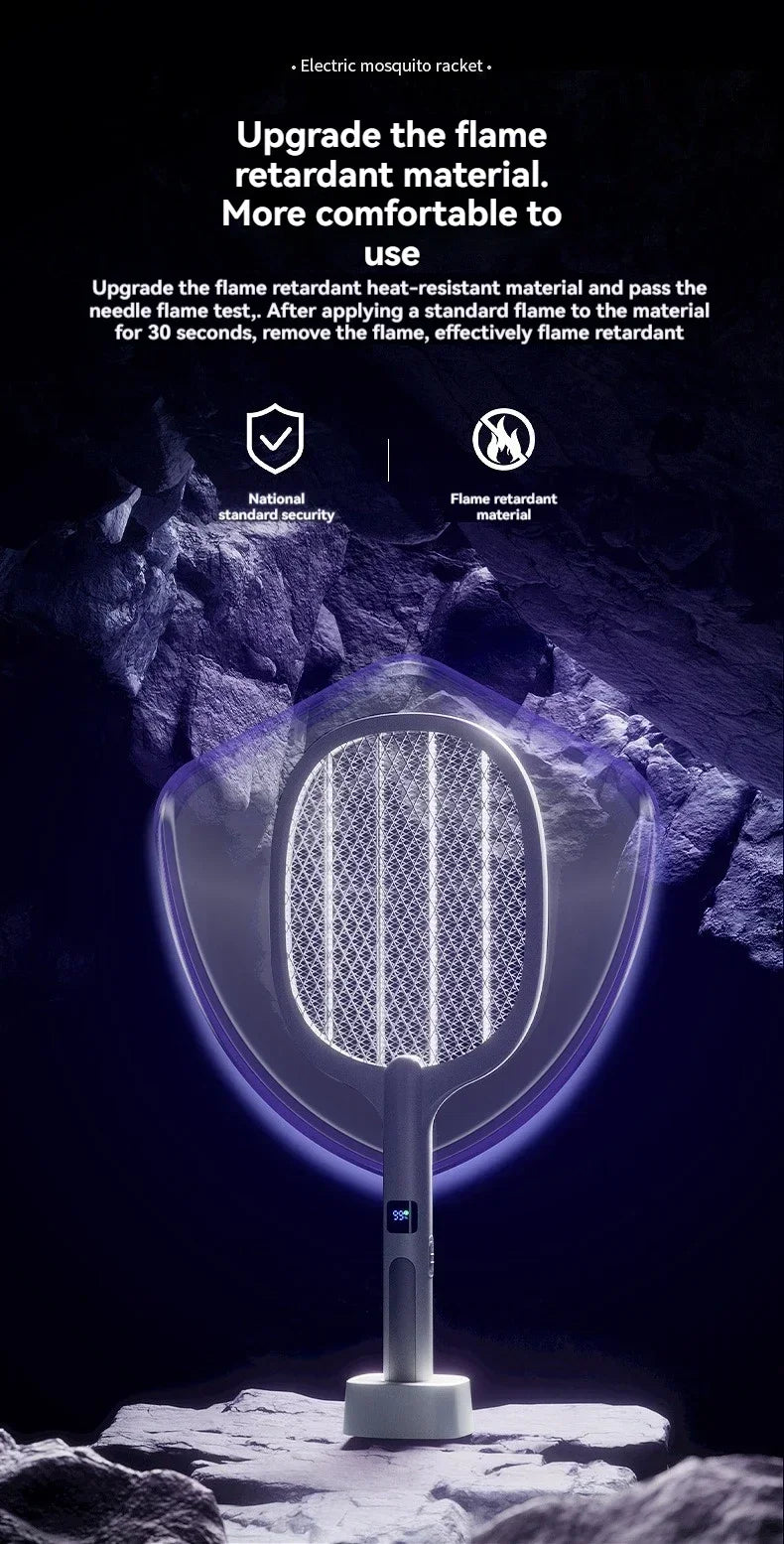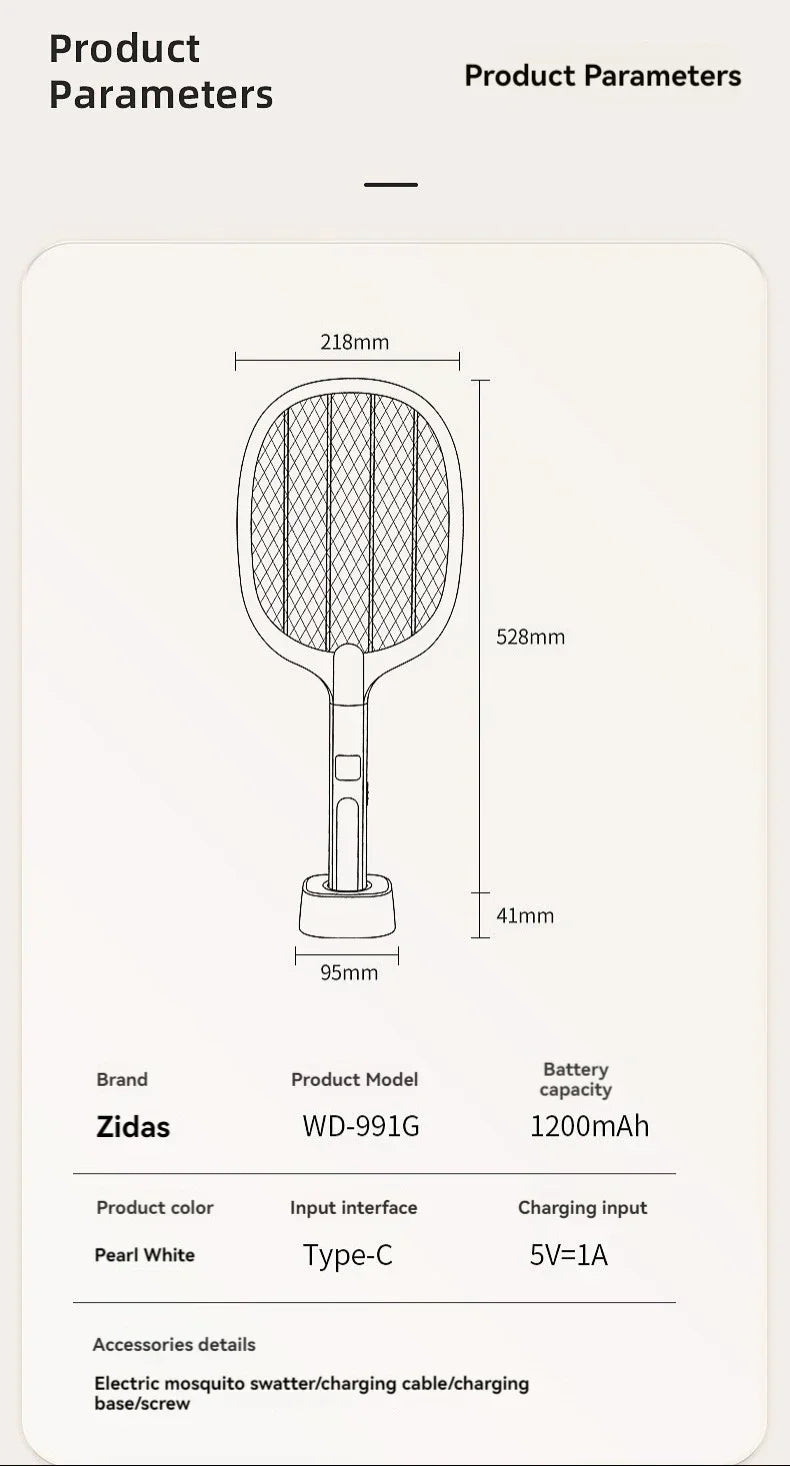 - 【2 in 1 Multi-function Flying Shooter Electric】In manual mode, continue to press the high-voltage working button to swing the electric mosquito killer manually. If you release the button, it will turn off the current mode in time. In automatic mode, the fly zapper is put into the charging base, the zapper will work automatically. The 5 LED beads will attract insects to the high voltage grid and then vibrate them.