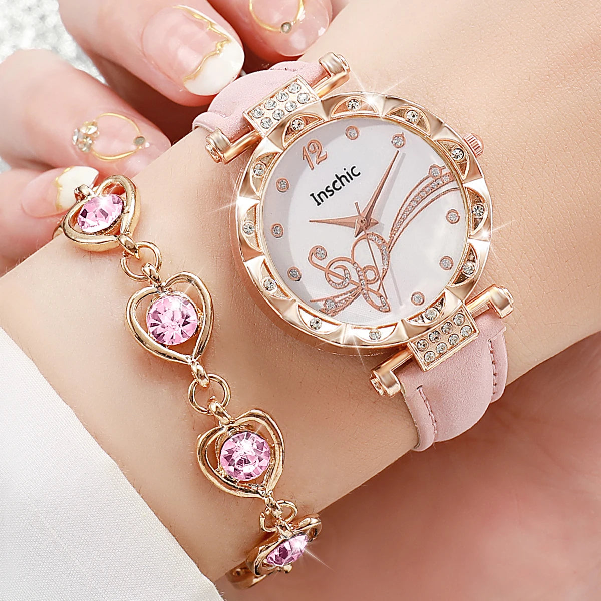 6PCS/Set Fashion Rhinestone Women's Watch Leather Band Analog Quartz Watches Rhinestone Heart Jewelry Set...
