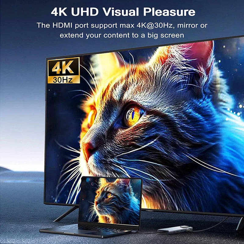 Expansion interface: 4K HDTV*1, 100Mbps RJ45*1, USB 2.0*1, USB 3.0*1, PD charging interface*1, Type C interface*1, TF/SD card slot*1After receiving the product and connecting it to the computer, install the product driver on the disk and use it.