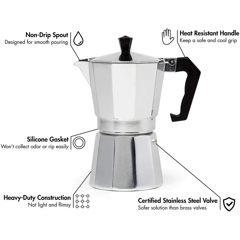 CLASSIC DESIGN AND SAFTEY MOKA POT: We want to bring you the perfect and safe Moka coffe maker, Made of a stylish and durable aluminum body in an 8-sided octagon shape to diffuse heat and enhance the coffee aroma. as well the espresso maker pot also has a rubber handle with a finger grip for easy handling and secure grip.