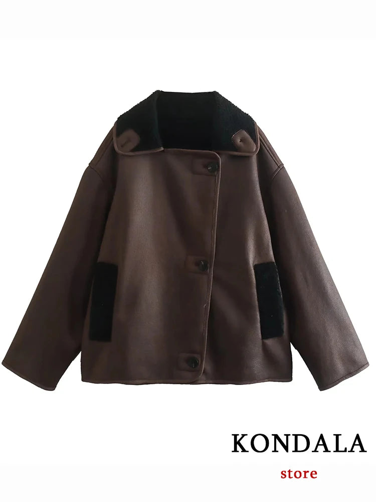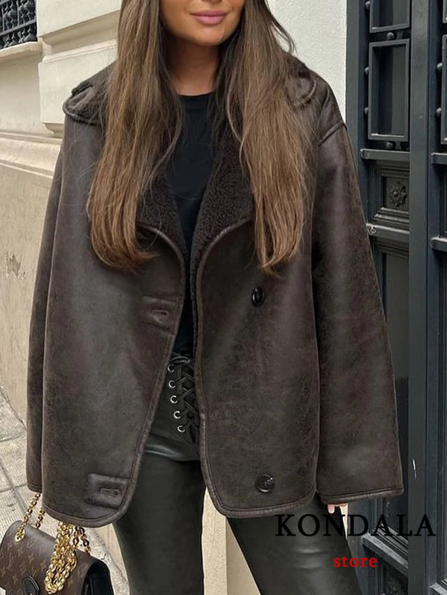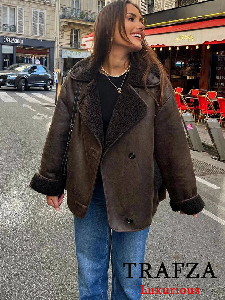 TRAFZA Streetwear Brown Leather Oversized Jackets Women Long Sleeve Single Buttons Thick Coats Fashion 20...